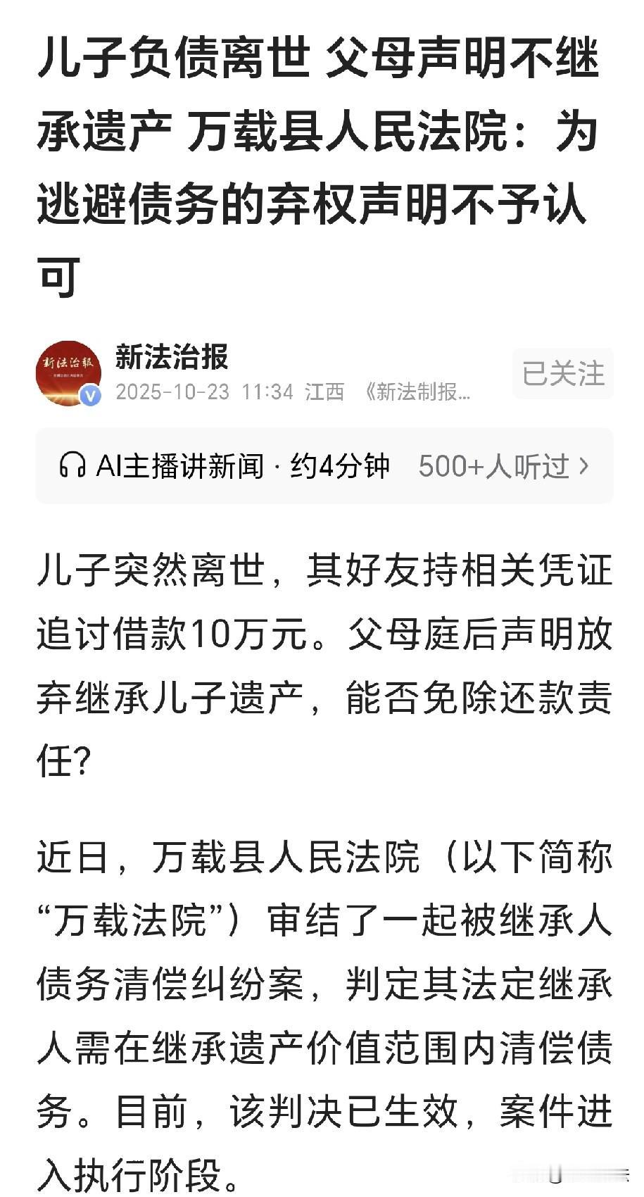 江西宜春,一男子借好友100000元,出于信任,好友没让他写借条,谁知男子突然去世,留下一辆车和公司股份,好友找到男子家里,拿出转账记录和V信聊天记录,要求男子父母还钱,男子父母拒绝,好友告到法院,男子父母立刻宣布放弃继承儿子遗产,法院经过调查,发现男子父母做了一件事情,案件顿时有了转机,判决令人意外! 小李和小王是多年的好友,他们经常在一起探讨人生,在生意场更是互相帮助。 2024年5月,小李遇到了难事,因为生意周转,急需一笔资金使用。 可是他手里的资金紧张,就缺了10万块钱,小李给小王打去了电话,把自己的情况大概说明了一下。 随后二人又在微信上聊天,俩人谈好了借款的事宜,出于信任,小王并没有要求小李给他写书面借条。 小王给小李转账100000元,希望能够帮助他度过难关。 小李拿到钱后,对小王的情谊千恩万谢,答应这笔钱用完之后,就会尽快给他归还。 可万万没有想到,天有不测风云,小李突然去世了,可是他上有父母,还有妻子。 小李的父母接受不了现实,父母妻子给他料理了后事。 小李生前有一辆车,还有公司的若干股份。 可是他走的仓促,没有给家人留下只字片语,他在外面的事情,家人也是一概不知。 之后,小李的车子被父母留下,他们出门办事,都是开着这部车辆。 由于事出突然,小王事后才得到了消息,听到小李突然去世,他深深的感到悲痛无比。 小李的辛苦他看在眼里,为了生计,他太过辛苦,早早就透支了身体。 可是,小李借了自己10万元资金,虽说俩人关系不错,可是这笔钱也是自己辛辛苦苦挣来的。 自己家里也有父母妻儿,如果不要回来,自己家里的生活又要咋办? 可小王又想,借钱时两人都觉得,朋友之间这点信任还是有的,口头约定就行,没必要搞那些繁琐的手续。 因此他手里并没有小李的借条,怎么向他的家人要钱,成了个最大的难题。 好在他们有转款记录,还有V信上的聊天记录,小李借钱时的通话,小王也做了录音。 小王来到小李父母家里,他先表达了自己的悲痛之意,随后拿出转款记录,聊天记录让小李父母观看。 小王希望他们作为小王的第一继承人,能够帮小李还这笔钱。 谁知小李父母一听,他们立刻表示反对,他们不知道儿子曾经向小王借钱,更不愿意替他还款。 更何况小王手里拿不出借条,空口无凭,怎么仅仅只能用转款记录和微信聊天就跑来要钱? 如今小李已经去世,小王跑来要钱,又没字据,根本就是死无对证。 万一小王只是趁人之危,想着儿子不在,反正说不清楚,再说,如果儿子遇到难事,为啥给自己的家人不说? 难道没有钱时,不是应该第一时间先找家人想办法筹钱吗? 再又说了,他们儿子优秀,他们不相信儿子会借钱,他还有公司的股份,怎么可能会缺这区区10万块钱? 小王说了半天,看小李父母坚决不肯还钱,还说了一大堆的原因,小王顿时急了。 10万元不是个小数,那是自己辛苦挣来的血汗钱,自己的家人也需要用钱,当初也是看在朋友的情谊才借给小李用来应急。 谁也没曾想到小李这么年轻,就会突然去世,可欠债还钱,天经地义,谁挣钱都不容易。 小王一纸诉状告到了法院,要求小李父亲老李、母亲郭某和妻子张某三人还钱。 在法院审理当中,小王向法院提供了小李借钱时的V信聊天记录,转账电子凭证,以及通话录音。 法院一一做了鉴定,小王提供的证据确凿,能够充分证明小李向其借款10万元的事实成立。 谁知小李的父母还是不愿意还钱,他们向法院提交了书面声明。 他们表示,自愿放弃对小李所有遗产的继承权,在他们看来,我们不继承儿子的遗产,我们也就不用还钱。 谁知法院并不这么认为,小李父母放弃继承遗产,时间不对。 他们是在诉讼程序已经推进到债权债务明确,并且进入了清偿阶段之后,这才声明要放弃继承儿子遗产。 并且,法院经过调查,发现小李留下的车辆已经被他父母实际占用,也就是说,他们实际上已经继承了小李的一部分遗产。 《民法典》1124条规定: 继承开始后,继承人放弃继承的,应当在遗产处理前,以书面形式作出放弃继承的表示;没有表示的,视为接受继承。 遗产处理前是放弃继承的核心时间节点,指遗产尚未被分割、处置或实际占有前。 小李父母在诉讼推进至债权债务明确后才声明放弃继承,且已实际占用小李遗留的车辆,本质上已经行使了遗产权。 小李父母延迟放弃的行为旨在逃避债务,违背了诚实信用原则,法院据此不予认可该声明效力。 《民法典》第1161条规定: 继承人以所得遗产实际价值为限清偿被继承人依法应当缴纳的税款和债务。 小李的车辆、公司股份均属遗产,其父母、妻子作为第一顺序继承人,未在法定时限内合法放弃继承,且父母已实际占有遗产,符合“已继承遗产”的情形。 最终法院判决,小李的父母及妻子郭某在遗产价值范围内偿还小李所欠的债务。 关注@王哥说法 多学法律少吃亏!