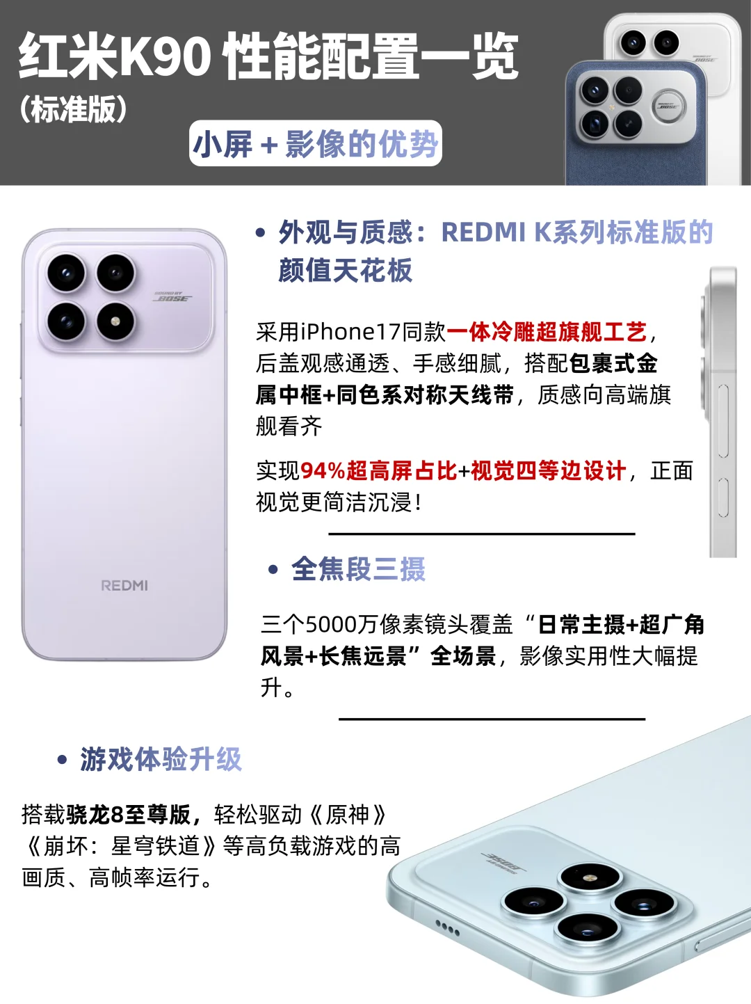 K90搭载3颗50MP镜头,支持2.5X的小长焦,拍照体验更好一些。