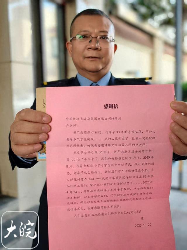 大皖新闻讯10月23日午后,蚌埠火车站收发室的窗台上,多了封字迹工整的感谢信,信封上“卢老师收”四个字格外醒目,信内字里行间满是感激:“若不是您热心相助,我母亲33年的寻亲心愿,不知还要等多久才能实现……”这封来自唐女士的信,揭开了一段关于牵挂、奔波与重逢的温暖往事。