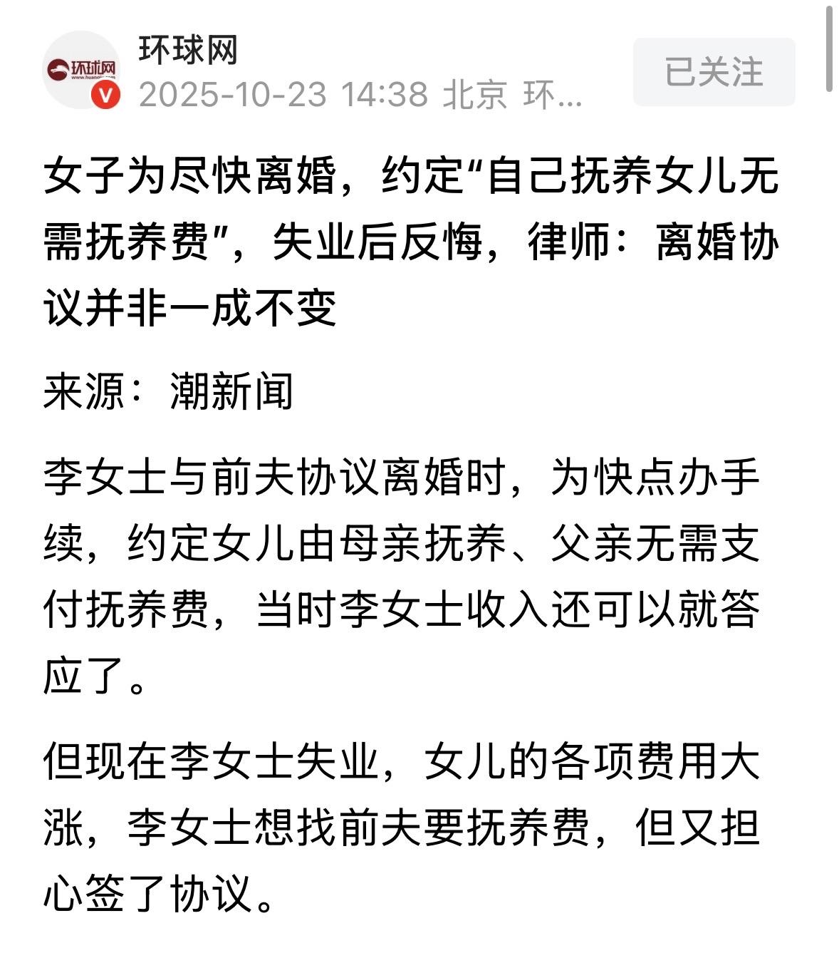 北京,女子为了尽快离婚,和前夫约定女儿由她一人抚养,前夫一分钱都不用掏,两人签下协议后顺利离婚,当时女子手头宽裕,独自养女儿绰绰有余,然而世事难料,离婚后女子丢了工作,一下失去经济来源,女儿的开销越来越高,女子实在无力负担,她后悔了,想让前夫搭把手,每月给她一笔抚养费,可当初白纸黑字签的协议让女子犯了难,她只好咨询律师,律师的回复出乎意料。 前些年,李芳和丈夫张强在民政局办了离婚手续。 当时李芳月薪可观,觉得独自抚养女儿小慧不成问题,当时为了尽快把手续办了,她主动提出,说孩子跟我,你不用出抚养费,咱好聚好散。 张强也没多争,痛快签了协议。 那会女儿小慧刚上幼儿园,每月开销没多少,李芳用工资养女儿绰绰有余。 谁料,天有不测风云。2024年初,李芳所在的公司突然裁员,她成了下岗名单上的第一批。 她在外找了半年工作,不是年龄超标就是薪资腰斩。 更要命的是,小慧如今上学的学费、补习班样样都要钱,加上其他零零碎碎的日常开销,一个月没有大几千根本打不住。 李芳看着每个月的账单直犯愁,银行卡里的余额也让她焦虑不已。 她想起前夫张强现在做了点小生意,看着生意挺红火,便试着拨通电话,说老张,小慧现在开销大,你能不能每月搭把手? 电话那头张强声音立马高了八度,说咱当时说好的,孩子归你养,我不掏钱!协议白纸黑字写着呢,你想反悔? 说完,他就啪地挂了电话。 李芳心寒了,她是说过自己养女儿这句话,可她哪能想到生活会有这么大的变动,她也不想开口麻烦前夫,可她实在没辙了。 前夫的袖手旁观让李芳气愤不已,她没想到对方这么狠心,自己的亲生女儿都不肯出钱养,她不死心,带着离婚协议找到了律师咨询。 接待她的律师仔细翻看协议后说:李姐,您这个情况法律有规定,也就是离婚后子女由一方抚养的,另一方应该负担部分或全部抚养费。 就算当时签了不要抚养费的协议,现在孩子实际需要增加,也可以起诉变更。 律师指着法条解释,您看这后半句写得多清楚,子女成长期间的合理需求受法律保护。 小慧现在上初中,教育费用属于必要支出,您现在失业属于情势变更,法院会考虑这些实际情况。 李芳将信将疑,说可当时我主动说不让他出钱的,现在反悔会不会被说成不守信用? 律师表示,法律保护的是孩子的利益,不是大人的面子。您现在收入减少不是主观不努力,是客观情况变化。法院判决时会综合孩子实际需要、父母负担能力、当地生活水平来定。 那么,从法律角度,怎么看待这件事? 《民法典》第1085条规定:离婚后,子女由一方直接抚养的,另一方应当负担部分或者全部抚养费。负担费用的多少和期限的长短,由双方协议;协议不成的,由人民法院判决。 李女士与前夫在离婚时通过协议约定"父亲无需支付抚养费",但后期因李女士失业、女儿教育费用激增,她无法独自负担。 法条明确规定,父母对子女的抚养义务不因离婚协议约定而免除。 即使李女士当时自愿放弃抚养费,但子女在成长过程中因客观情况变化,如教育费用增加、抚养人收入减少产生的合理需求,仍受法律保护。 首先,李女士失业属于"情势重大变更",非主观不努力导致的收入减少,其次,女儿升初中后教育支出属于"合理需求",且费用增长超出李女士当前经济承受能力。 所以,如果李女士诉至法院,要求前夫每月付一定的抚养费,极大概率会得到法院的支持。 不过有人就说了,那写协议的意义是什么?原来离婚协议也不是"一签定终身"啊! 协议双方确认,而且是自愿情况,说反悔就反悔,哪还有诚信可言? 问题是不要抚养费是不是财产分割比例多了,比如房子或存款及有价物资给女方以换取不需要男方不支付抚养费?如果是,对另一方是不公平的,你吃尽抹干然后说没钱养了,让对方出,公平吗? 如果女方因经济问题,无力抚养女儿,可以移交监护权,交给男方抚养,签定了离婚协议还要更改,那还能用什么方法约束离异的夫妻呢? 也有人说,抚养孩子是义务,约定是协商后的契约。约定抚养一方,确实没有抚养的能力了,或者没有履行抚养义务,这个时候双方约定失效,根据实际情况重新议定。 很多人搞不明白如果可以这样反悔,那么写协议的意义是什么?对此我来解释下。协议作用是:对女方有利的地方保留,不利的地方反悔或者剔除。 比如本案中,写协议,当初是为了早点离婚,这就是对女方有利的点。 对此,你怎么看? 关注@运良说法. 学法律知识不迷路 头号创作者激励计划 (文中均为化名)
