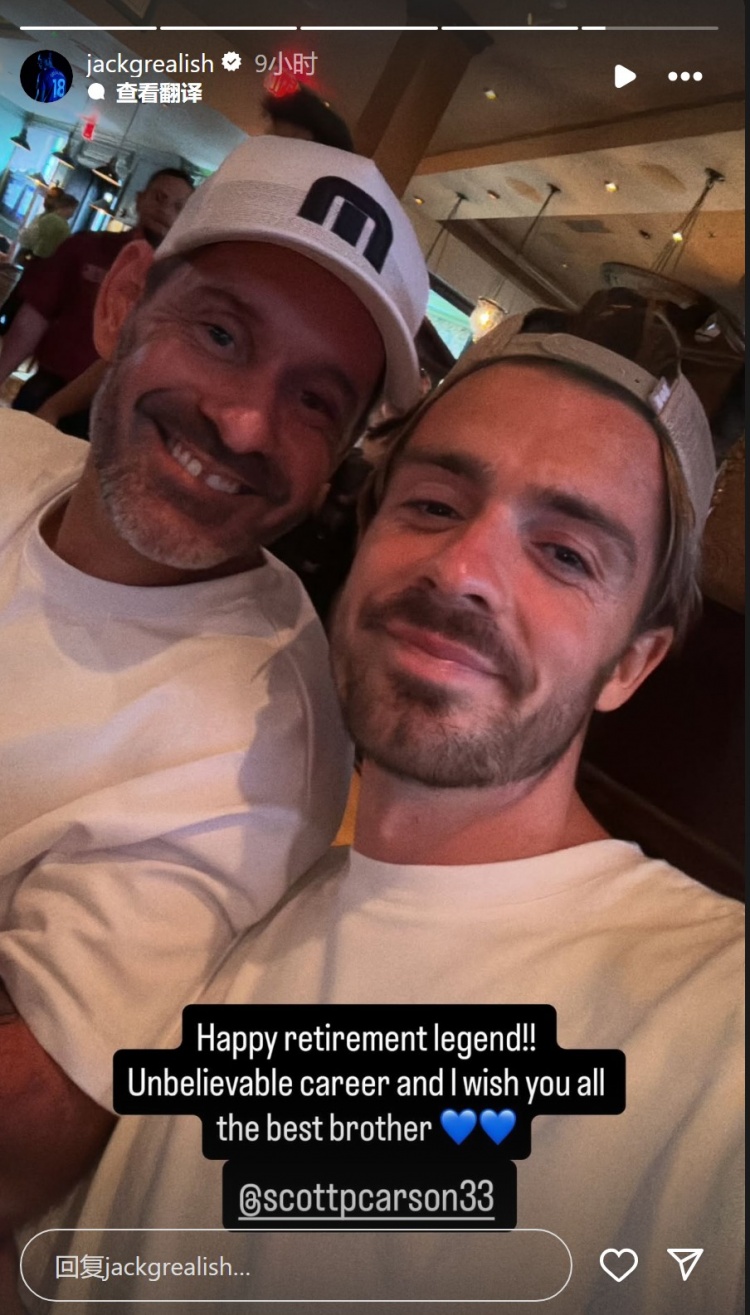 格拉利什社媒晒出与卡森的合照,配文:“退役快乐,传奇!”