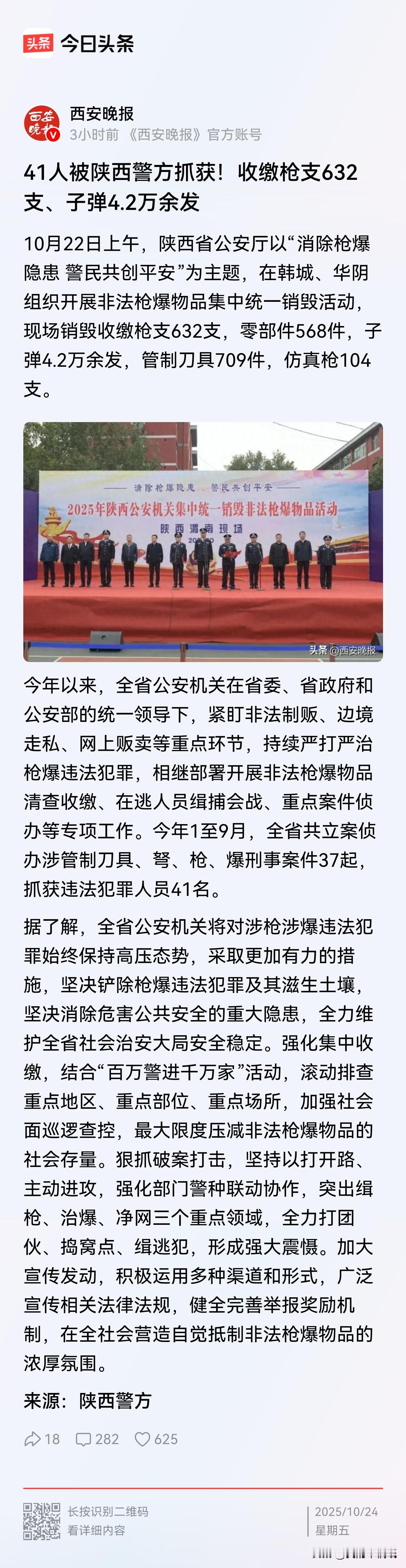 据报道,陕西公安在韩城、华阴共销毁枪支632支、零部件568件、子弹4.2万余发、管制刀具709件以及仿真枪104支。 这一消息引发不少网友惊呼:“了不得!”有网友指出,国家早已明令禁止个人私藏枪支弹药,然而仅陕西两地就在一段时间内查获如此数量的枪支和数万发子弹,令人对社会治安状况产生担忧。 也有网友认为,当前仍能集中查获如此大量的枪支弹药,说明该地区过去对非法枪爆物品的管控存在薄弱环节,打击力度不足。若任由此类违禁物品泛滥,将严重影响人民群众的安全感和正常生活。 更有网友对数据本身表示怀疑:“真的假的?这都什么年代了,两个县城竟能查获六百多支枪、几万发子弹?” 对此你怎么看?欢迎评论区留言讨论!