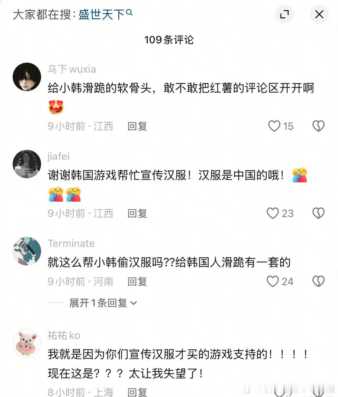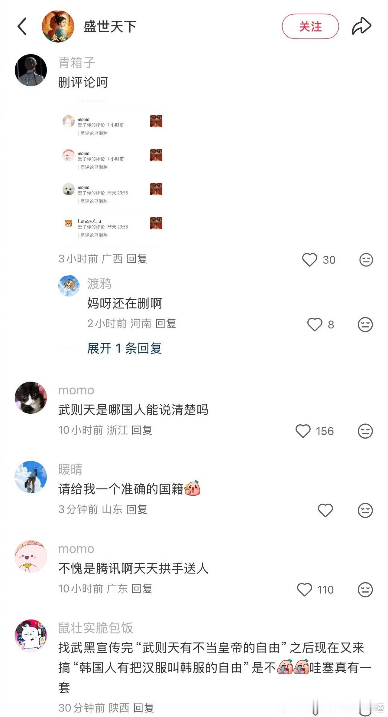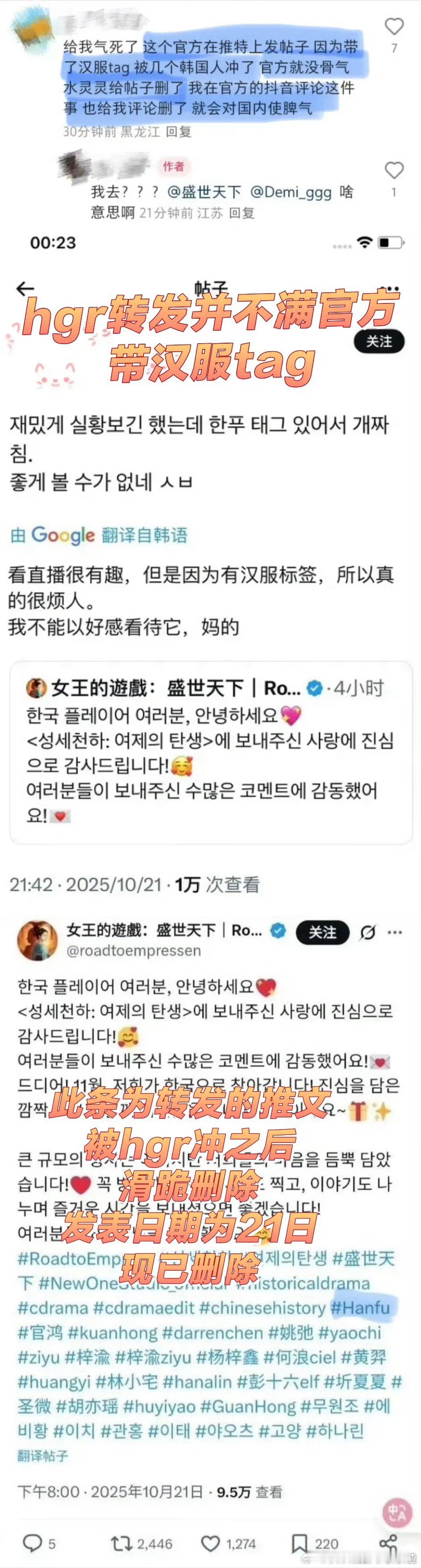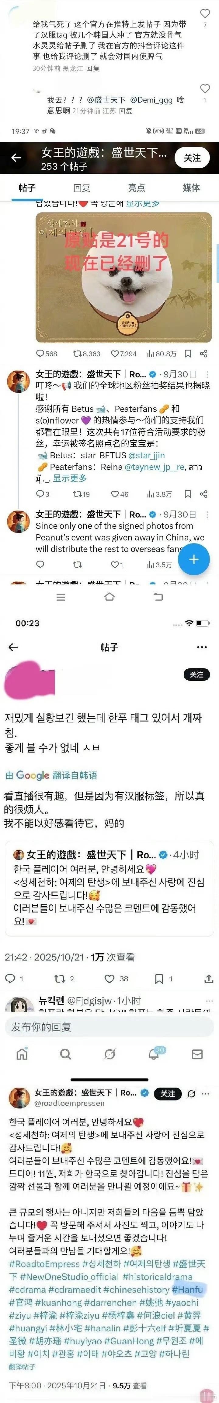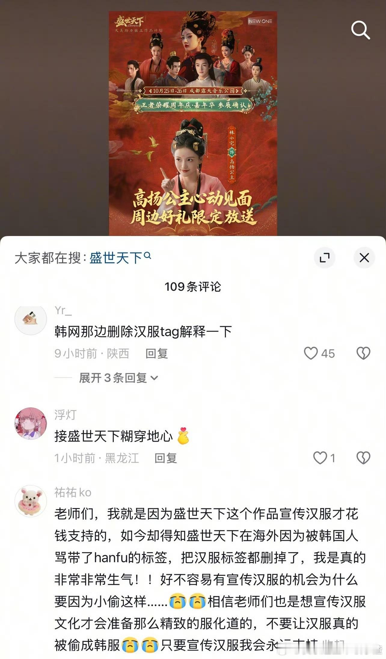 《盛世天下》官方在推特发帖带了汉服tag,被韩国人骂偷韩服,结果官方秒滑跪删帖。