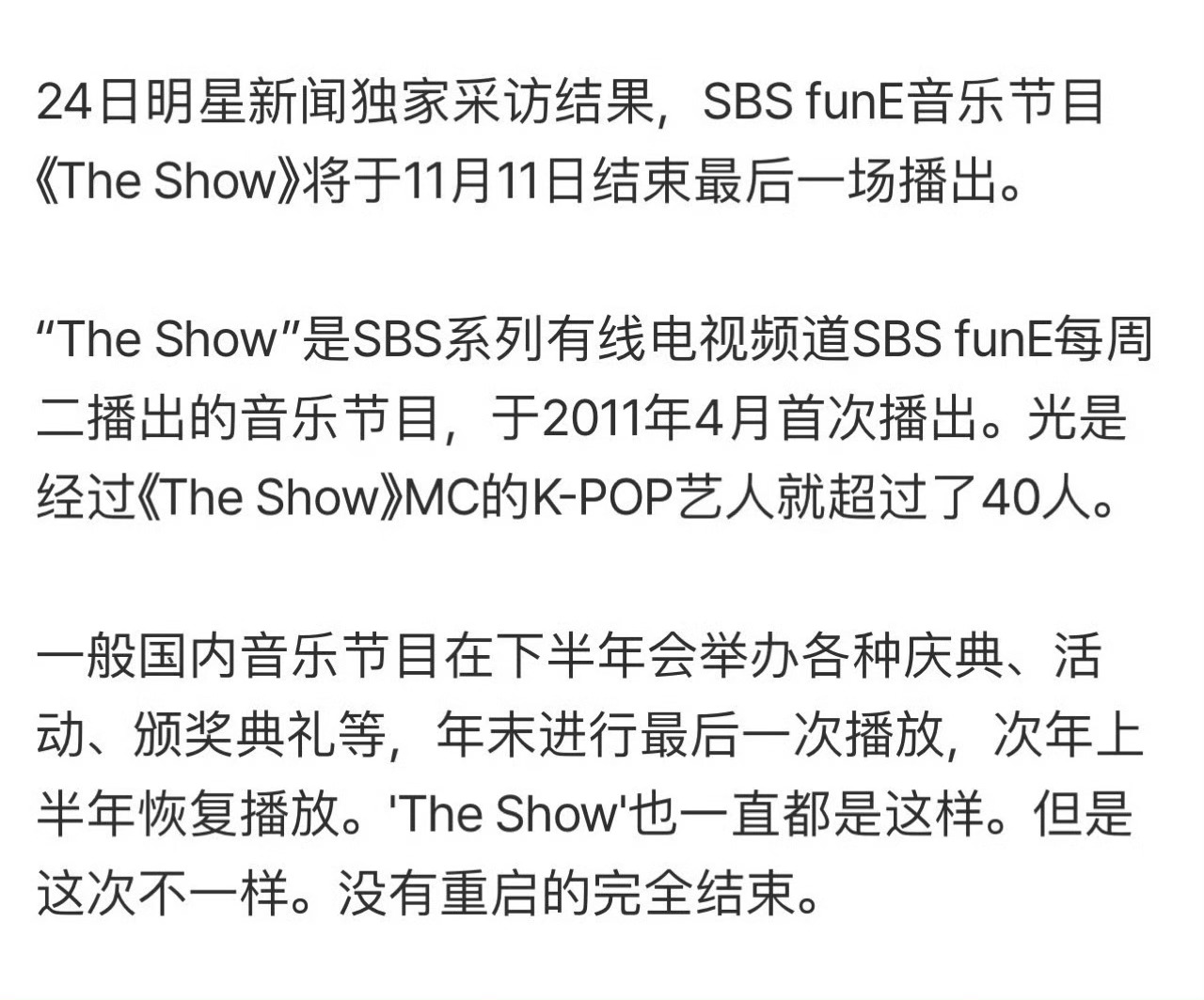 SBS打歌节目TheShow正式宣布停播11月11日播出最后一集,不会再重启