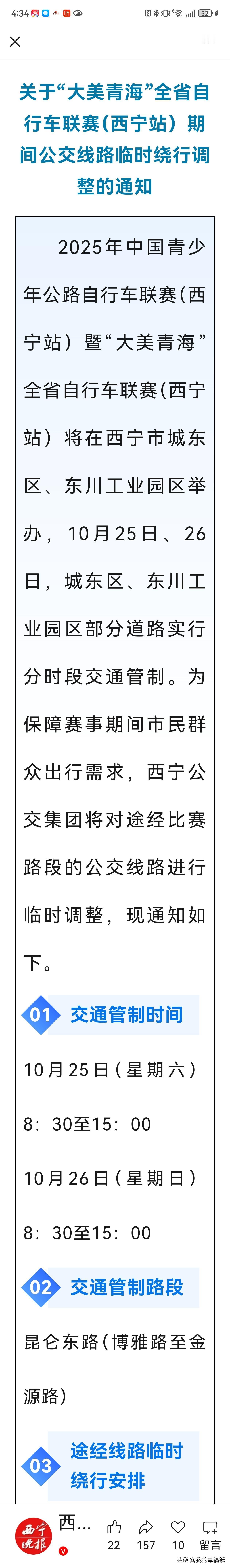 明后两天,西宁12条公交线路作临时绕道调整! 因“大美青海”自行车联赛,10月25日-26日每天8:30-15:00,城东区昆仑东路(博雅路至金源口)实行交通管制。 坐公交的小伙伴请提前规划路线,奔走相告,互相提醒!绿色出行虽好,可别耽误事哦~ 秋日生活打卡季