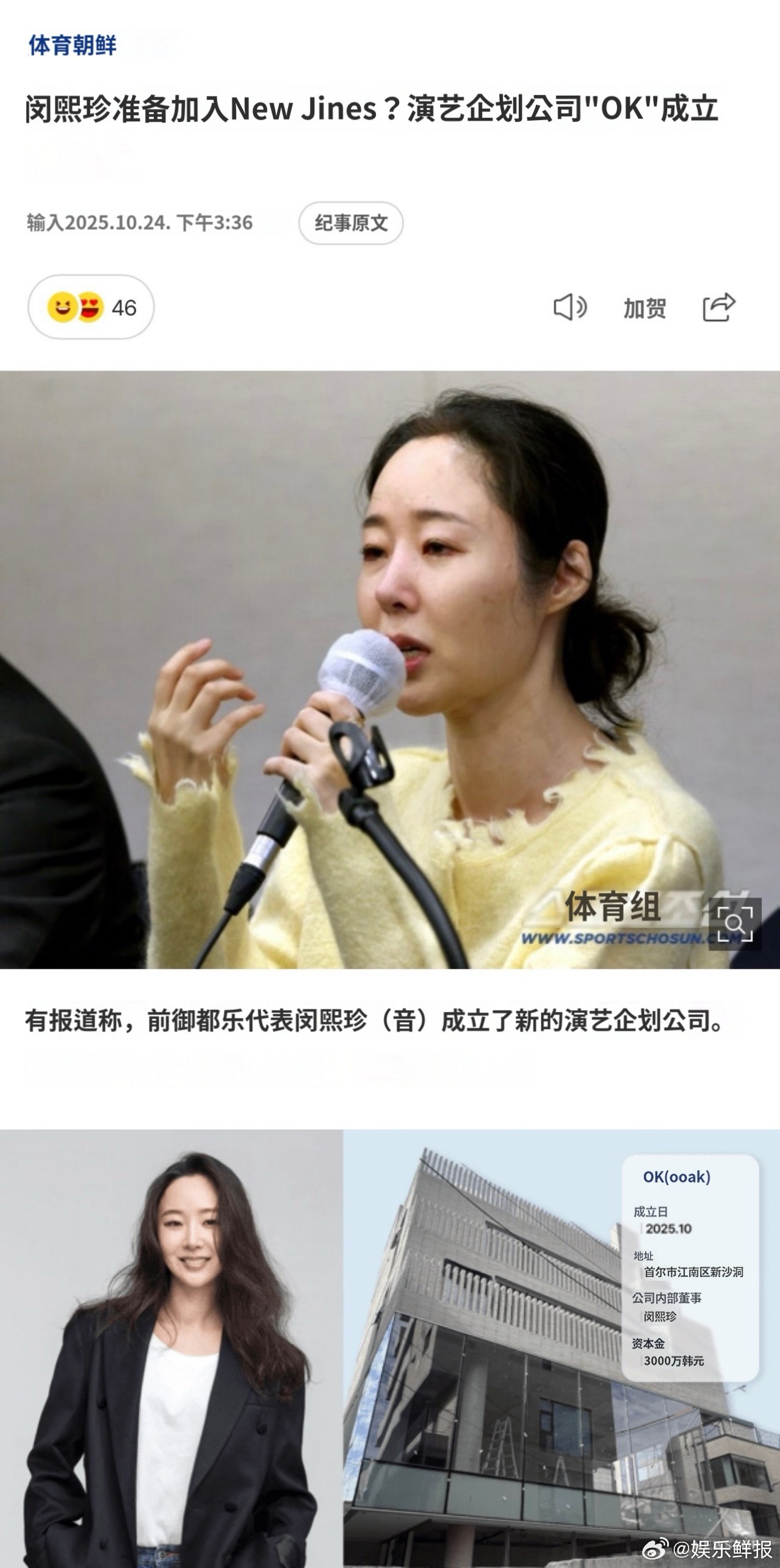 我天!韩媒报道闵熙珍成立新娱乐公司OOAK,目前正在准备招募newjeans,鲸这下真的可以回归了吗?[捂嘴哭]
