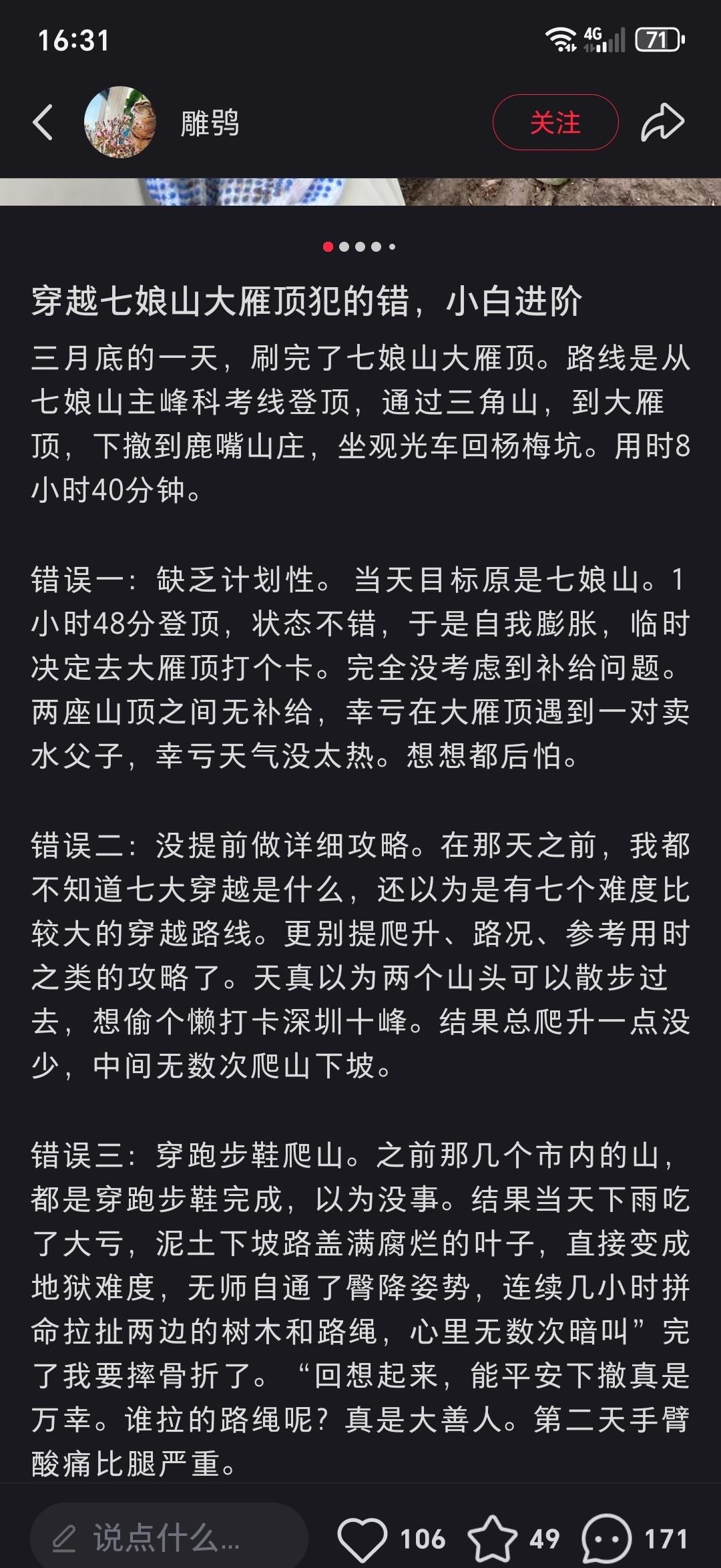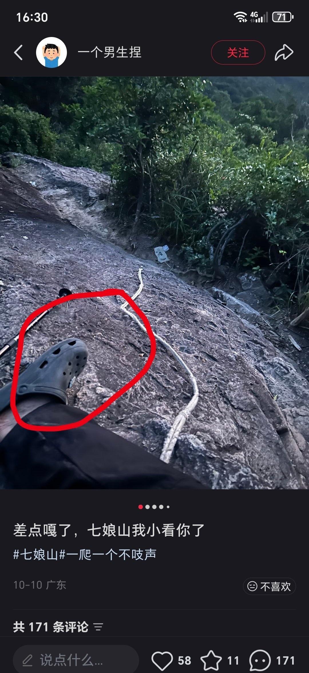 我稍微看了下这条线路,其实本身并不难,包括穿越大雁顶,需要在山脊上穿行,如果有成熟的团队,详细的计划,这条线路应该是蛮有趣的,风景也还可以。 整条线路海拔提升也有限,难度“初看不高”,所以很容易让人轻敌。所以一些人不做攻略,装备简单,单枪匹马,胆大妄为,你看图二这人,穿个洞洞鞋就去了,图五的博主穿跑步鞋就去了。 很多人都是个人独自前往的,网上有相约的但也不知道约你的人水平,可能也是个雏。然后装备又不好也不够,补给不充足,攻略又不做,山上可能信号也不好,天黑了非常容易迷路,山上植被又丰富,有滑坠的风险。 所以,不要轻视大自然,不要高估自己的能力。有时候我觉得我出行的计划已经很简单了,但对比一下这些人,我还是蛮高段位的。主要是我怕死,我谨慎,我考虑多一些。