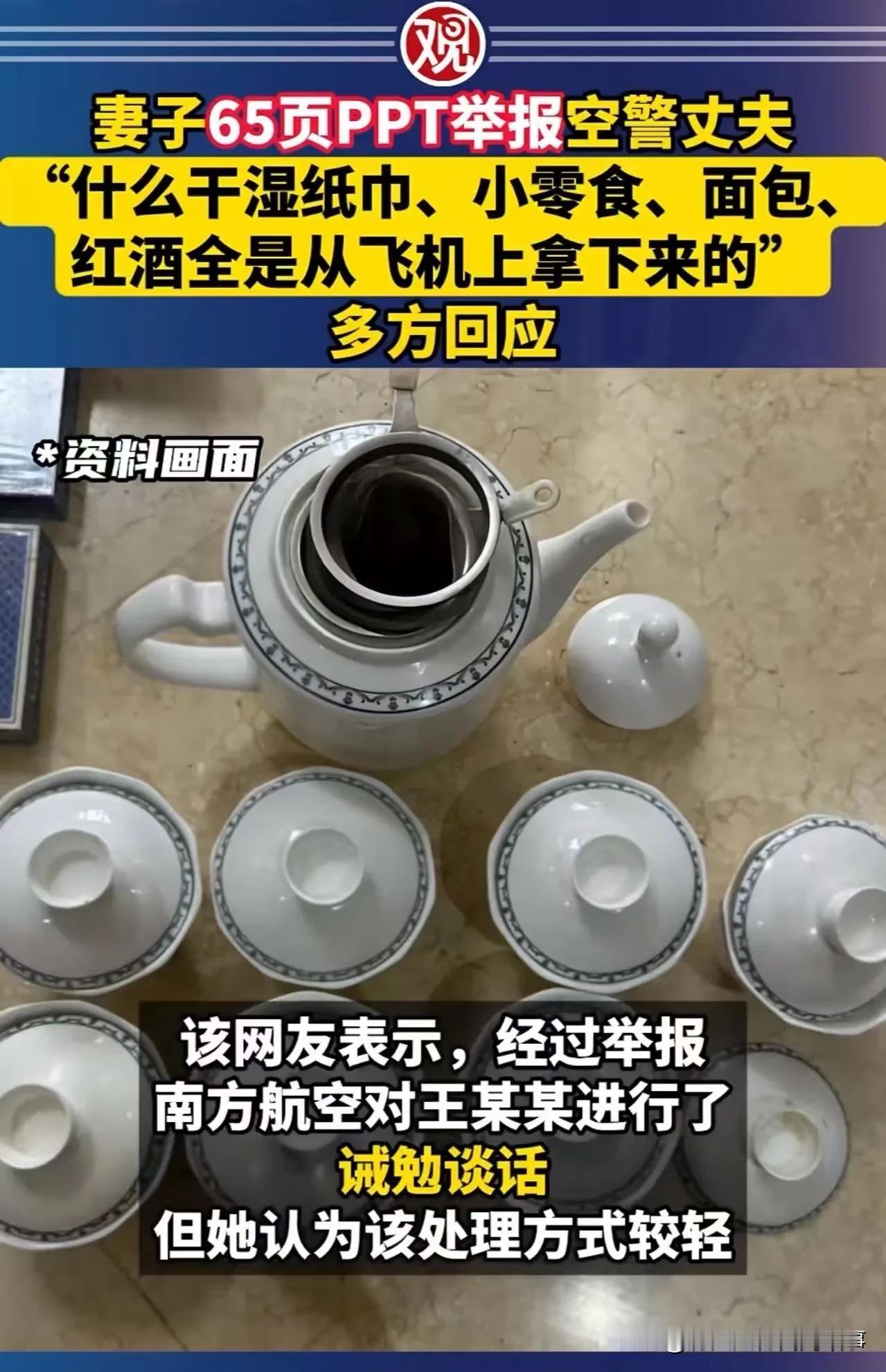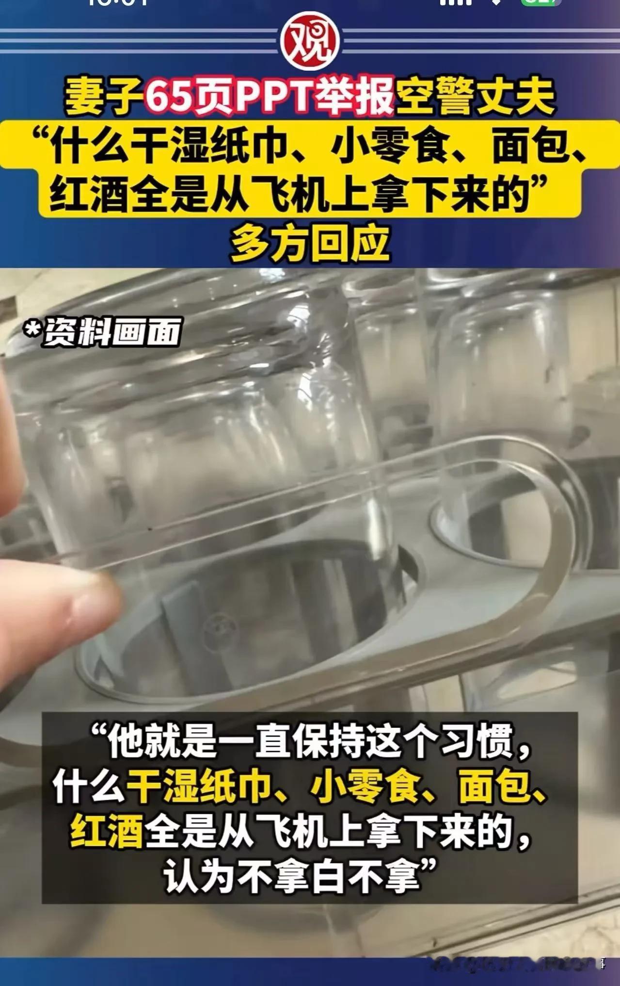65页PPT揭开空警丈夫机舱供品私藏真相,网友热议背后的行业镜像 近日,一则“妻子制作65页PPT举报空警丈夫”的消息引发社会广泛关注。据澎湃新闻报道,该妻子在举报材料中明确指出,丈夫数年来多次将飞机机舱内的供品私自携带回家,涉及干湿纸巾、小零食、面包乃至红酒等各类物品,且丈夫对此行为抱有“不拿白不拿”的错误认知,将公共资源视为可随意占有的私产。 作为维护航空安全的关键岗位人员,空警肩负着保障机舱秩序与乘客权益的重要职责,其职业行为本应严格遵循法律法规与行业准则,恪守公共利益至上的原则。此次事件中,涉事空警对机舱供品的私藏行为,虽单一个体价值或许不高,但本质上是对航空公共资源的侵占,更是对职业操守与岗位信任的漠视,不仅损害了航空公司的形象,也削弱了公众对航空安全保障体系的信任度。 事件曝光后,网友的讨论呈现出多元视角。有观点认为,从妻子披露的“黑料”来看,涉事空警仅涉及此类物品私藏,未出现更严重的违规违纪行为,因此调侃“一个人枕边人只能挖到这点黑料,这个人在空乘行业真的太干净了”。但调侃背后,更应引发行业对职业规范管理的深度思考——航空行业各岗位均需坚守职业底线,即便看似“微小”的违规行为,若不及时纠正,也可能逐渐侵蚀行业公信力。 目前,相关事件的具体调查进展尚未公布,但其已为航空从业者敲响警钟:职业尊严源于对每一份规则的敬畏,公共资源的守护需要每一位从业者的自觉。期待相关部门能依法依规开展调查,给出公正处理结果,既以个案警示行业,也切实维护航空行业的职业规范与公共信任。 素材来源于网络,侵权删除。