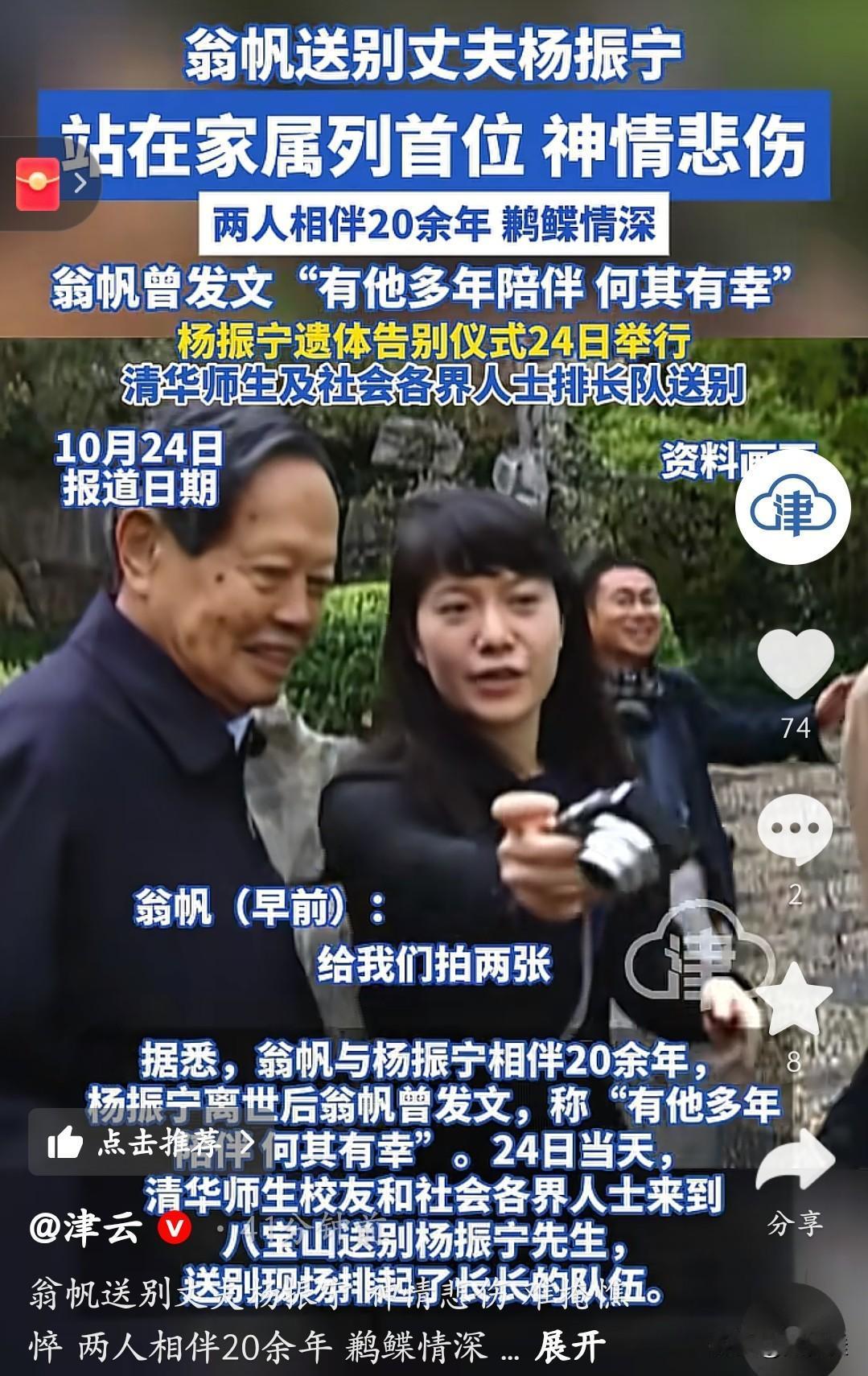 杨振宁先生的告别仪式上,翁帆站在家属最前面,一身黑、别着白花,眼窝都凹下去了,这可是陪了她二十多年的人啊。 当年她举着相机喊“给我们拍两张”的笑,现在全变成红着眼圈的绷着。她之前说“有他陪伴何其有幸”,现在这“幸”成了攥在手里的念想。人这一辈子,能有个人陪你从青春到白头,走的时候能让这么多人记着,也算值了!