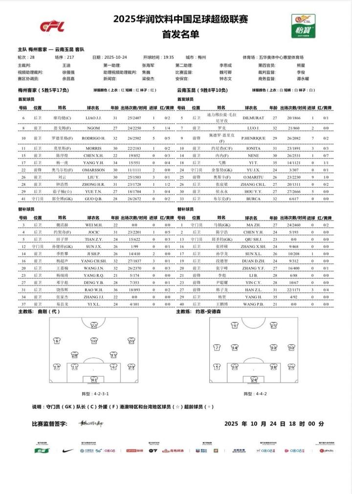 虎扑10月24日讯北京时间今晚19:35,梅州客家即将在主场迎战云南玉昆,赛前双方公布首发名单。