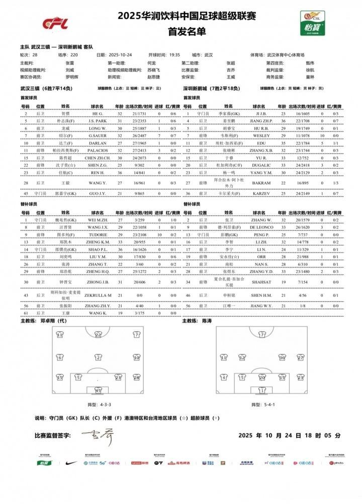 虎扑10月24日讯北京时间今晚19:35,武汉三镇即将在主场迎战深圳新鹏城,赛前双方公布首发名单。