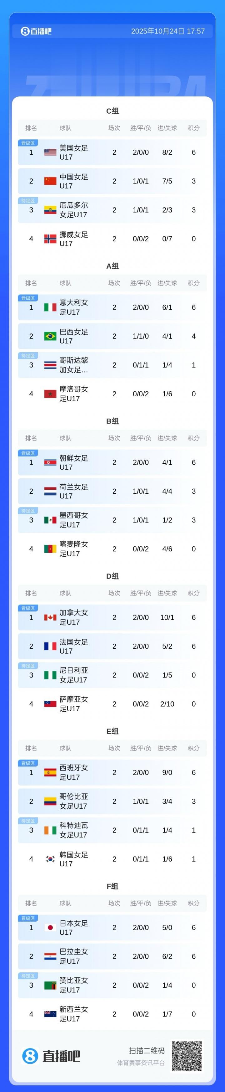 本届U17女足世界杯共有24队分为6个小组,每组前二以及4个成绩最好的小组第三组成16强。若中国女足U17末轮战败,则可能需要以小组第三的身份与其他队比较战绩。