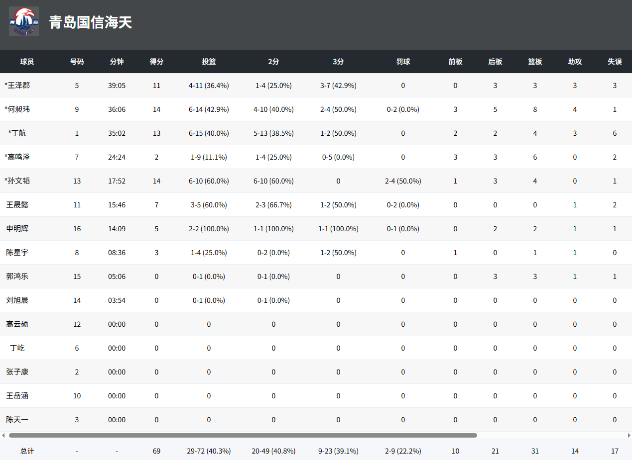 青岛U17男篮:孙文韬14分、何昶玮14分8篮板、丁航13分