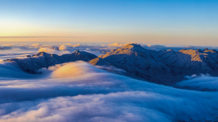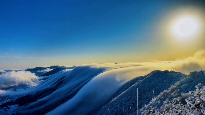 冬日是太子尖最具诗意的季节,冰晶缀满枝头,云海在脚下翻涌,偶尔卷来的雪粒子,让人恍惚走入“明月出天山,苍茫云海间”的千年意境。有游客用无人机捕捉到这样的画面:云瀑从山顶奔泻而下,高达数百米,阳光穿过水汽,折射出彩虹光晕,宛若银河倒悬。正是这“日出、云海、雾凇”的“三绝”,让太子尖从众多山景中脱颖而出,成为长三角徒步爱好者心中的宝藏之地。