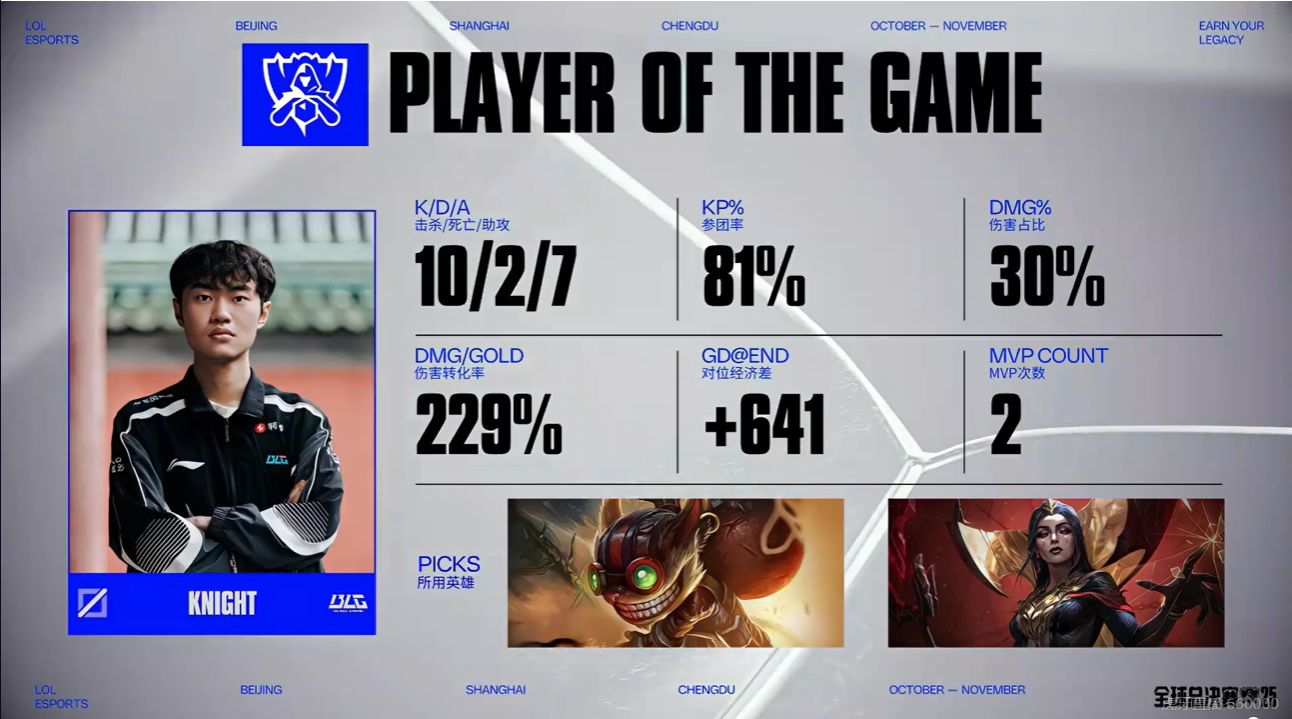 Knight妖姬打出10/2/7的战绩,拿下BLG对战VKS次局MVP