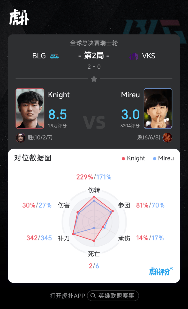 虎扑10月24日讯在刚刚结束的S15世界赛瑞士轮BLG对战VKS的比赛中,Knight妖姬打出10/2/7的战绩,拿下BLG对战VKS次局MVP