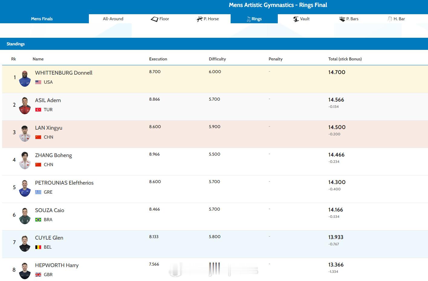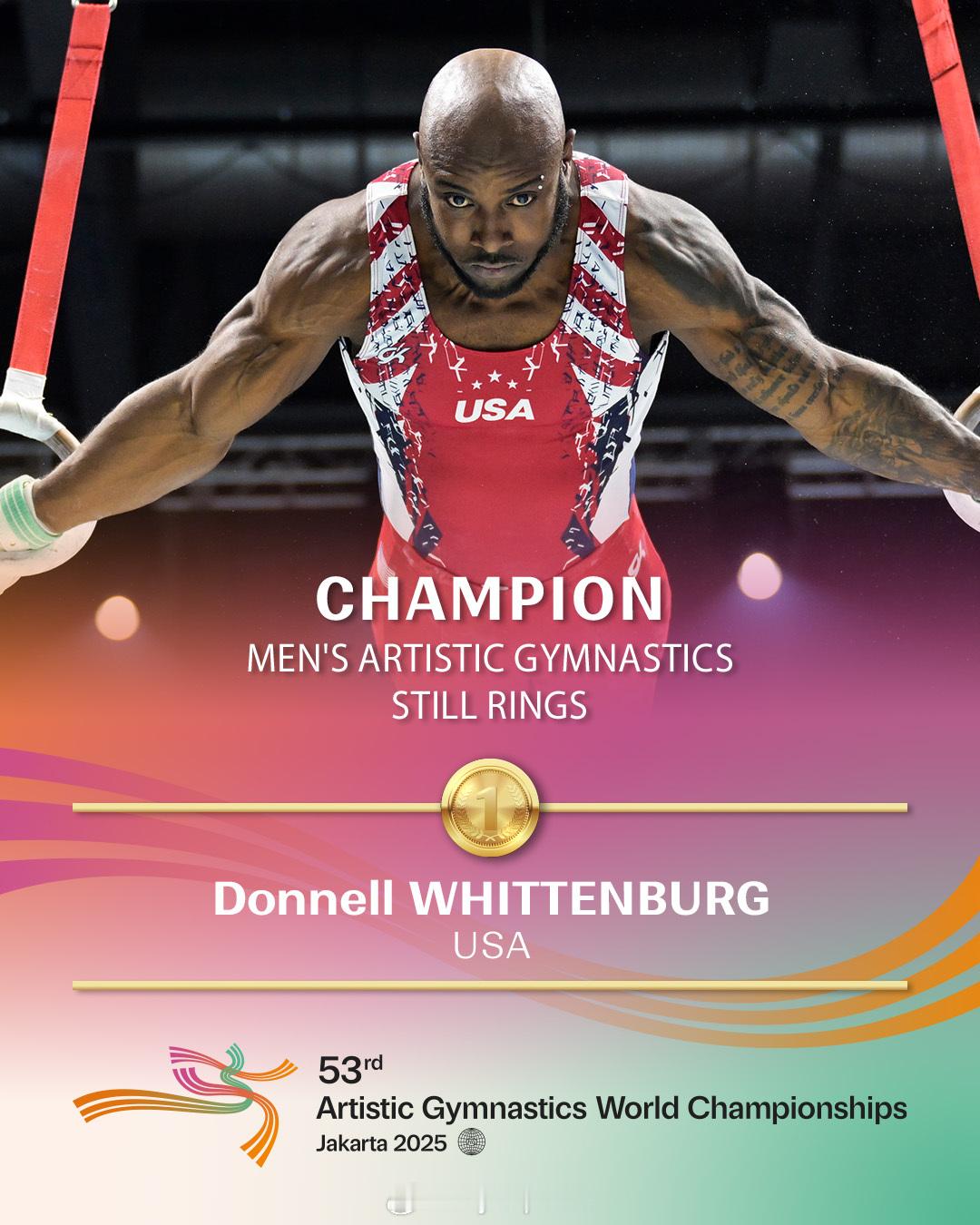【体操世锦赛吊环美国夺冠 兰星宇摘铜张博恒第四】2025年体操世锦赛 10月24日雅加达,2025年体操世锦赛男子吊环决赛结束。压轴出场的美国选手惠滕博格出色完成全场最高难度6.000的动作,以14.700分夺得冠军,土耳其阿斯尔获得亚军。资格赛排名第一的中国选手兰星宇摘得铜牌,成绩为14.500分。张博恒名列第四。