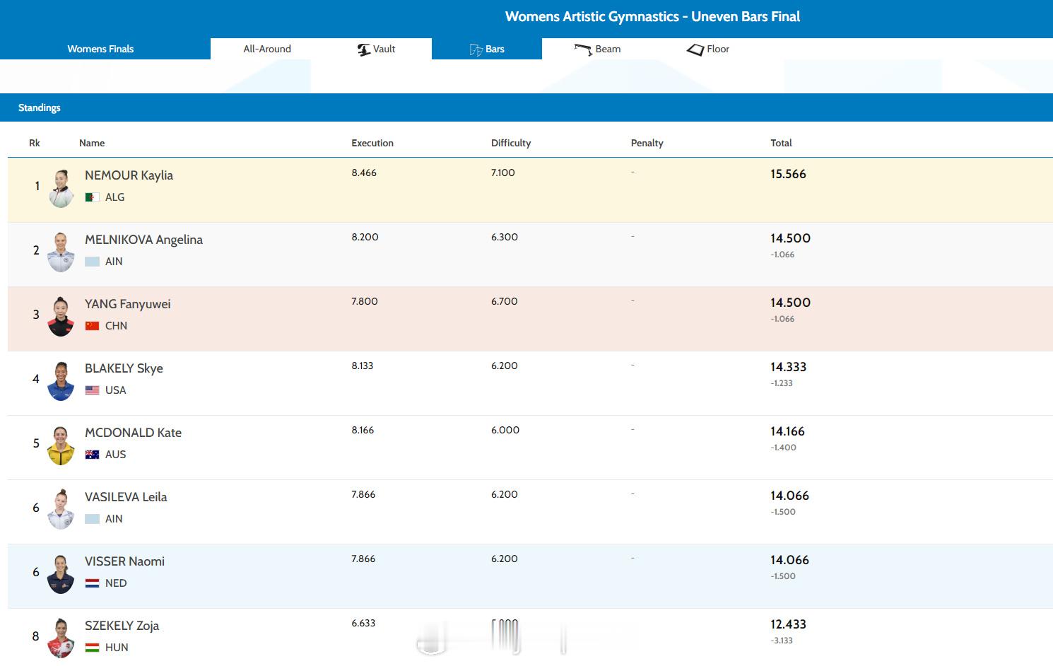 【体操世锦赛高低杠内穆尔碾压夺冠 杨凡予微摘铜】2025年体操世锦赛 10月24日雅加达,2025年体操世锦赛女子高低杠决赛结束。阿尔及利亚名将内穆尔自成一档,以一套行云流水的动作得到15.566分,比亚军高出1.066分,难度分7.100和完成分8.466均排名第一。中国选手杨凡予微和俄罗斯名将梅尔尼科娃均为14.500分,因为完成分劣势,获得铜牌。