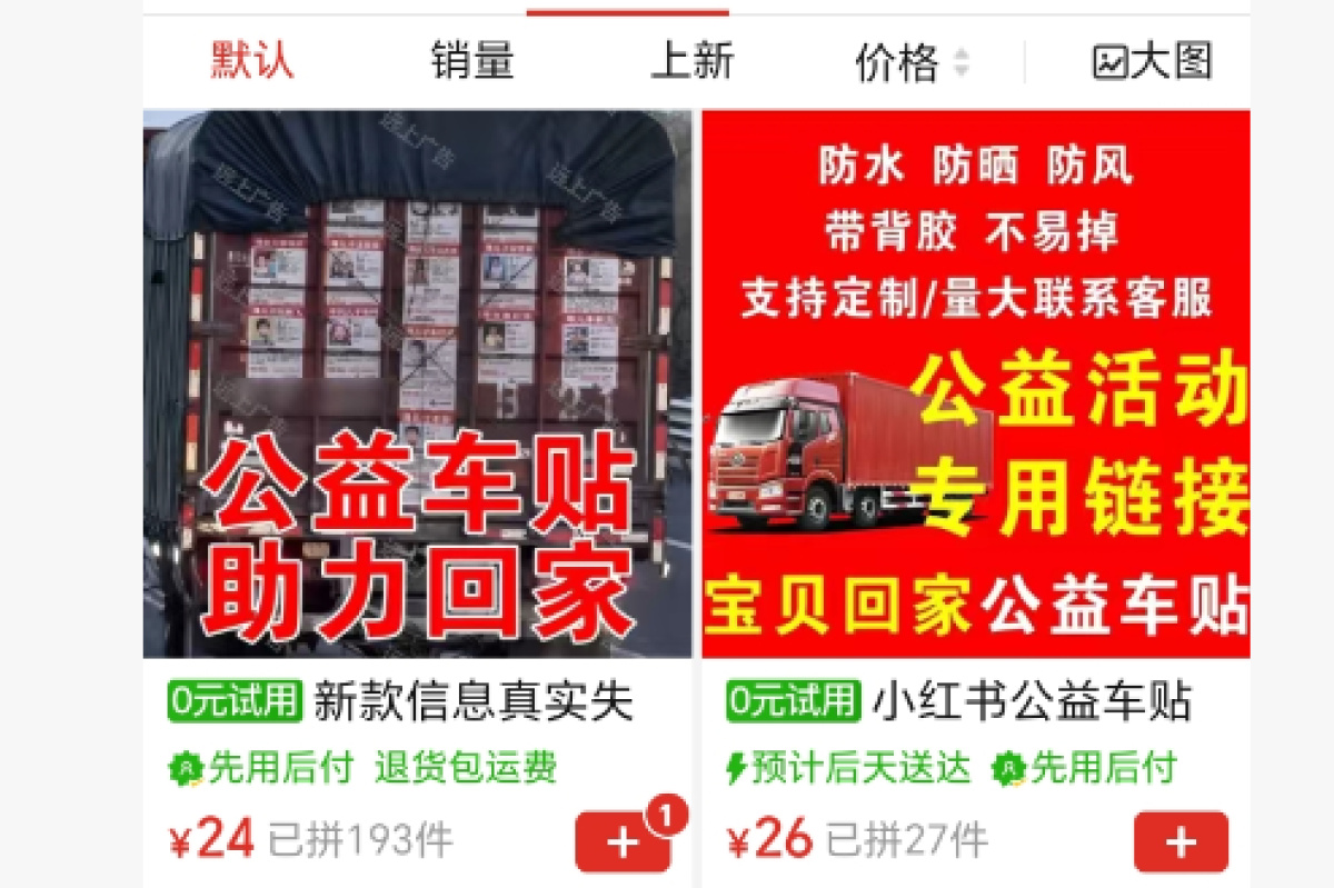 记者注意到,“宝贝回家公益车贴”是该店铺销量第一的单品,已售出近200件。20张20cmX30cm的车贴价格约为36元,另有不同规格和价格可选。