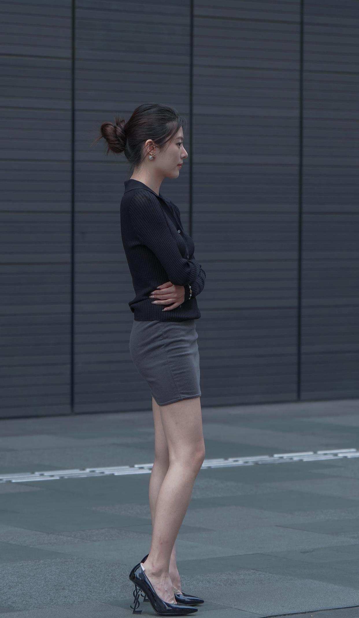 黑色坑条针织衫勾勒出干练线条,灰色包臀裙尽展优雅身姿,再搭配精致配饰与个性鞋履,每一处细节都在诉说着都市女性的自信与品味。