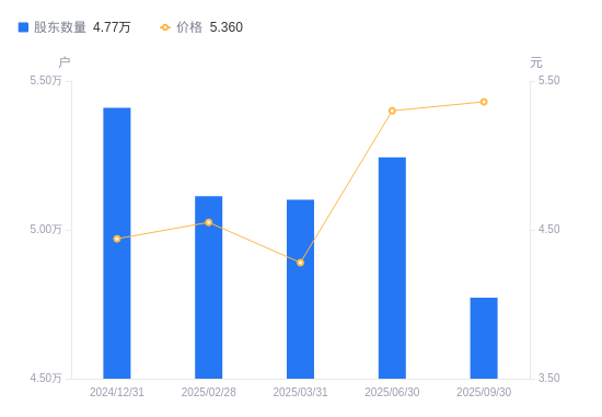 日期A股户数(户)流通A股户均持股数(股)户均持股市值(万元)2025-09-304772217114.659.172025-06-305243915575.158.252025-03-315101216010.846.852025-02-285113215973.277.272024-12-315409915097.236.702024-09-304993316356.737.342024-06-304639917602.546.212024-03-314786417063.879.732024-02-294888016709.196.172023-12-314872816761.317.46
