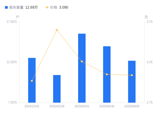 日期A股户数(户)流通A股户均持股数(股)户均持股市值(万元)2025-09-3012694811315.113.502025-06-301448559916.333.072025-03-311605138950.842.922025-02-2810916213161.414.802024-12-3113041811016.313.332024-09-3011098212943.673.042024-06-3010868713216.981.972024-03-3111375012632.013.172023-12-3111647812336.163.732023-09-3011819512156.963.73