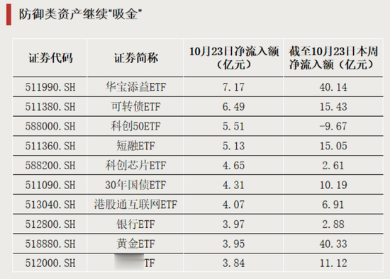 防御型ETF方面,主投货币、债券、银行、黄金等方向的ETF继续获资金净流入。
