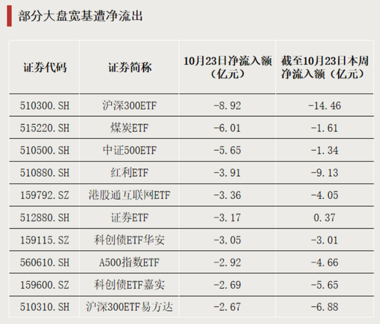 部分大盘宽基产品则在10月23日遭遇较多资金净流出。单日净流出金额前十的产品中,有两只挂钩沪深300指数,一只挂钩中证A500指数。3只产品单日净流出合计超过14亿元,截至10月23日,本周累计净流出约26亿元。