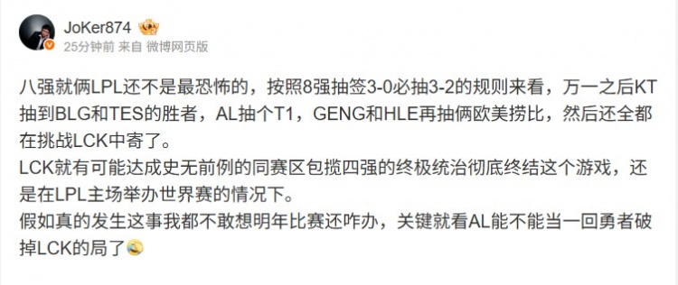Joker:八强就俩LPL还不是最恐怖 万一八强抽到LCK全寄了就完蛋了