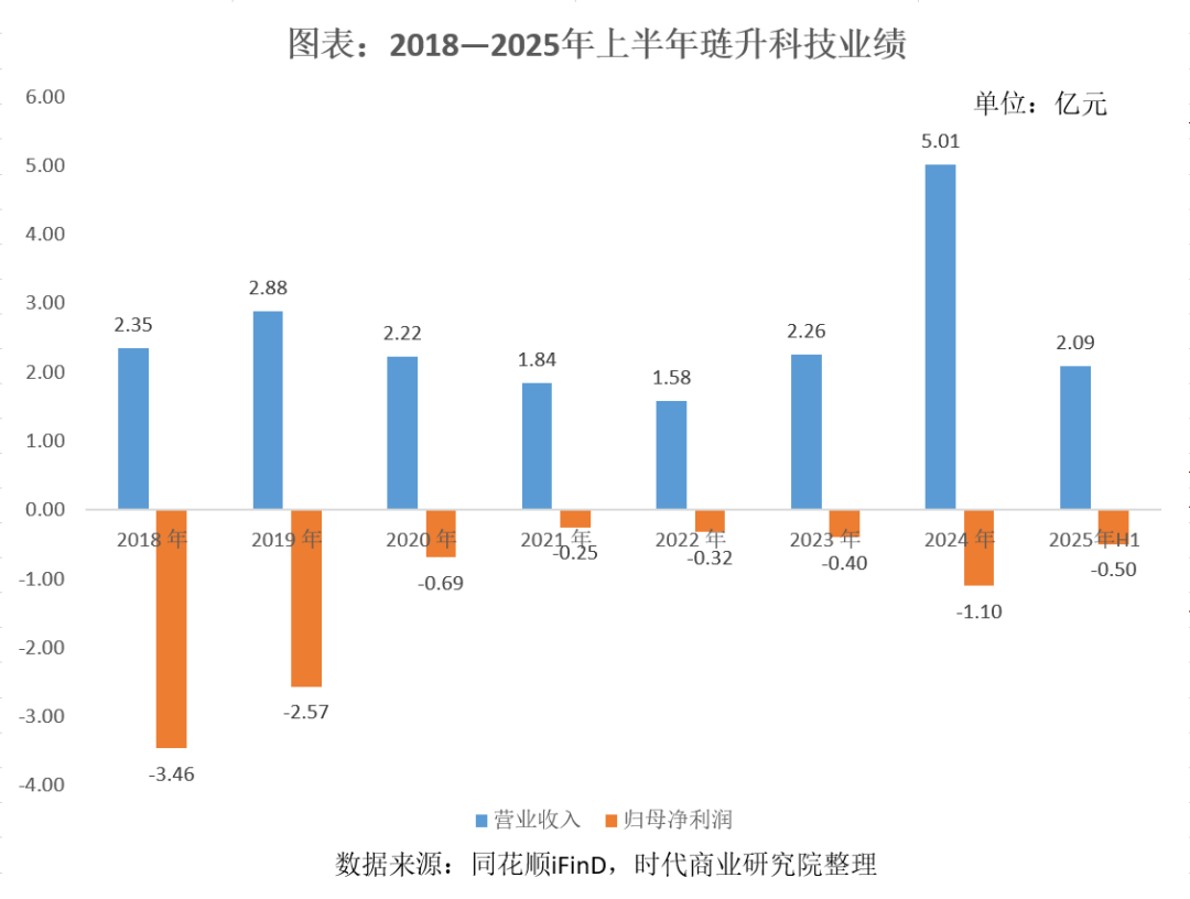 跨界光伏后,琏升科技营收快速增长,从2022年的1.58亿元增长至2024年的5.01亿元,增长超两倍;2025年上半年进一步同比增长35.90%至2.09亿元,但亏损也在不断放大。