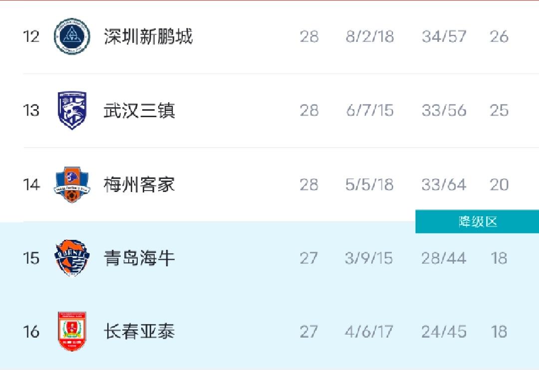 两场比赛过后,深圳新鹏城、武汉三镇在多赛一轮的情况下分别领先降级区8分、7分,基本确定上岸;梅州客家输球后,多赛一轮领先降级区2分;长春亚泰、青岛海牛同积18分,将分别在明天与后天出战,对手是天津津门虎和北京国安。