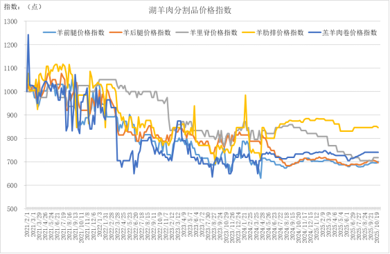 羊前腿价格指数报701.57点,较上期上涨1.03%,价格报49.0元/公斤,较上期上涨0.5元/公斤;羊后腿价格指数报696.24点,较上期下跌0.75%,价格报53.0元/公斤,较上期下跌0.4元/公斤;羊里脊价格指数报717.95点,较上期持平,价格报56元/公斤;羊肋排价格指数报846.37点,较上期下跌0.54%,价格报55.0元/公斤,较上期下跌0.3元/公斤;羊肉卷价格指数报740.48点,较上期持平,价格报52.5元/公斤。