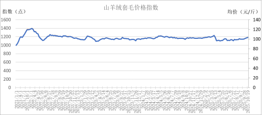 截至10月19日,山羊绒(套毛)价格指数报1187.14点,较上期上涨0.78%,山羊绒(套毛)价格报103.4元/斤,较上期上涨0.8元/斤。