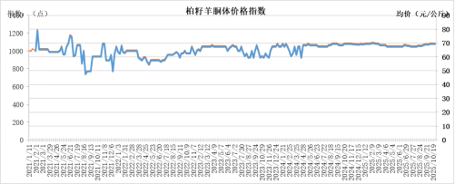 截至10月19日,羊胴体价格指数报1077.03点,较上期持平,价格报70.0元/公斤。