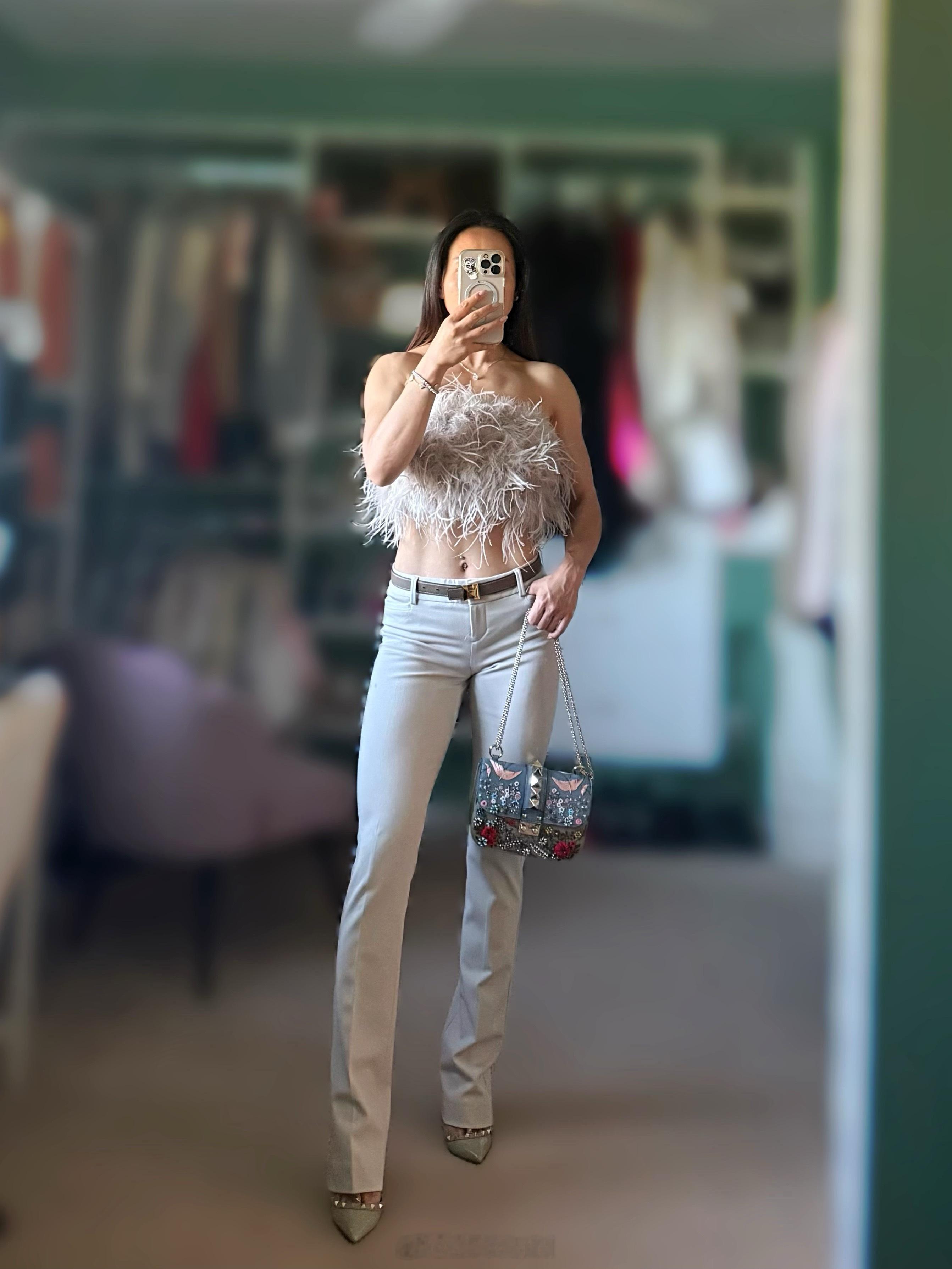毛毛上衣和模特都是S号3,但因为包装和运输的关系,收到时,毛毛被压扁了😂 估计挂一挂就和模特的款式更接近了。
