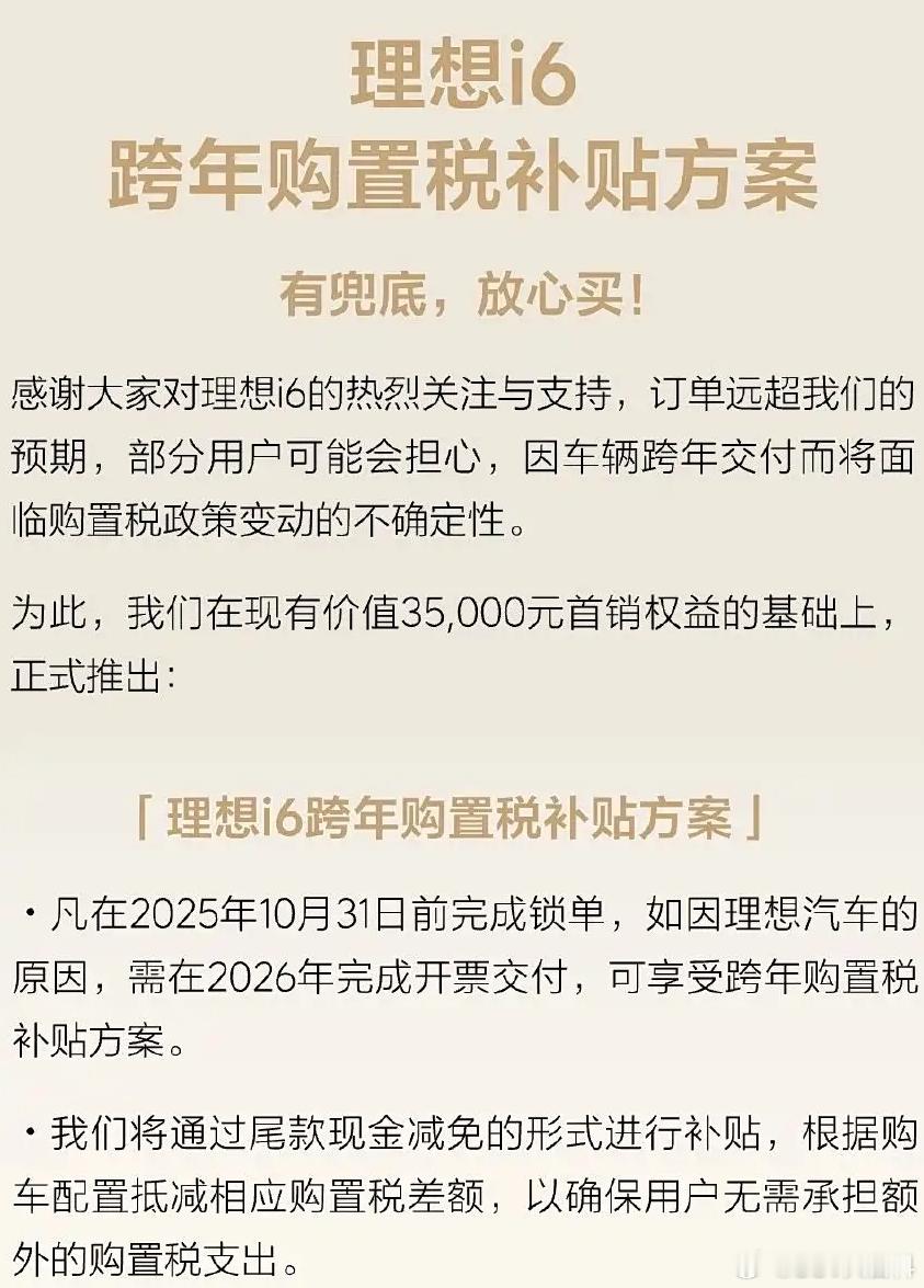 理想i6 :针对10月31日前锁单,2026交付的用户,理想将以尾款现金减免的形式,为用户兜底因购置税退坡产生的差额费用
