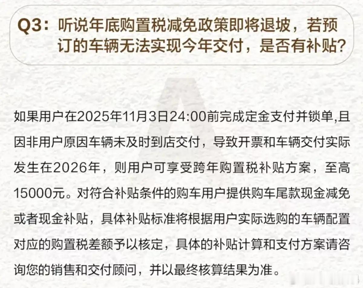 一到年底,各家车企就开始兜底购置税了,看看到底谁更有诚意?SUV大百科[超话]小米汽车[超话] :11月30日24点前锁单,因厂方原因导致锁单车辆需在2026年开票交付,可享跨年购置税补贴方案,以尾款减免的形式,最高补贴不超过1.5万元,适用在售全系车型