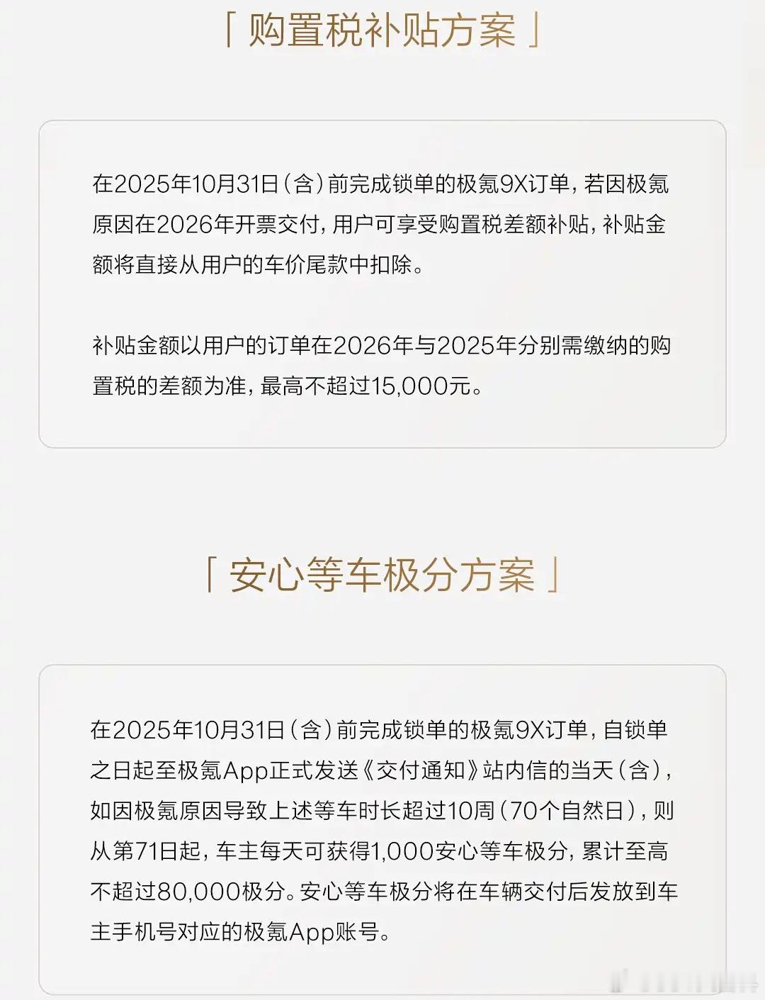 极氪9X :10月31日(含)前锁单,若因极氪原因在2026年开票交付,可享尾款减免的购置税差额补贴,最高不超过15000元;如果等车时长超过10周,则会在此之后获得1000极分/日,累计至高80000极分