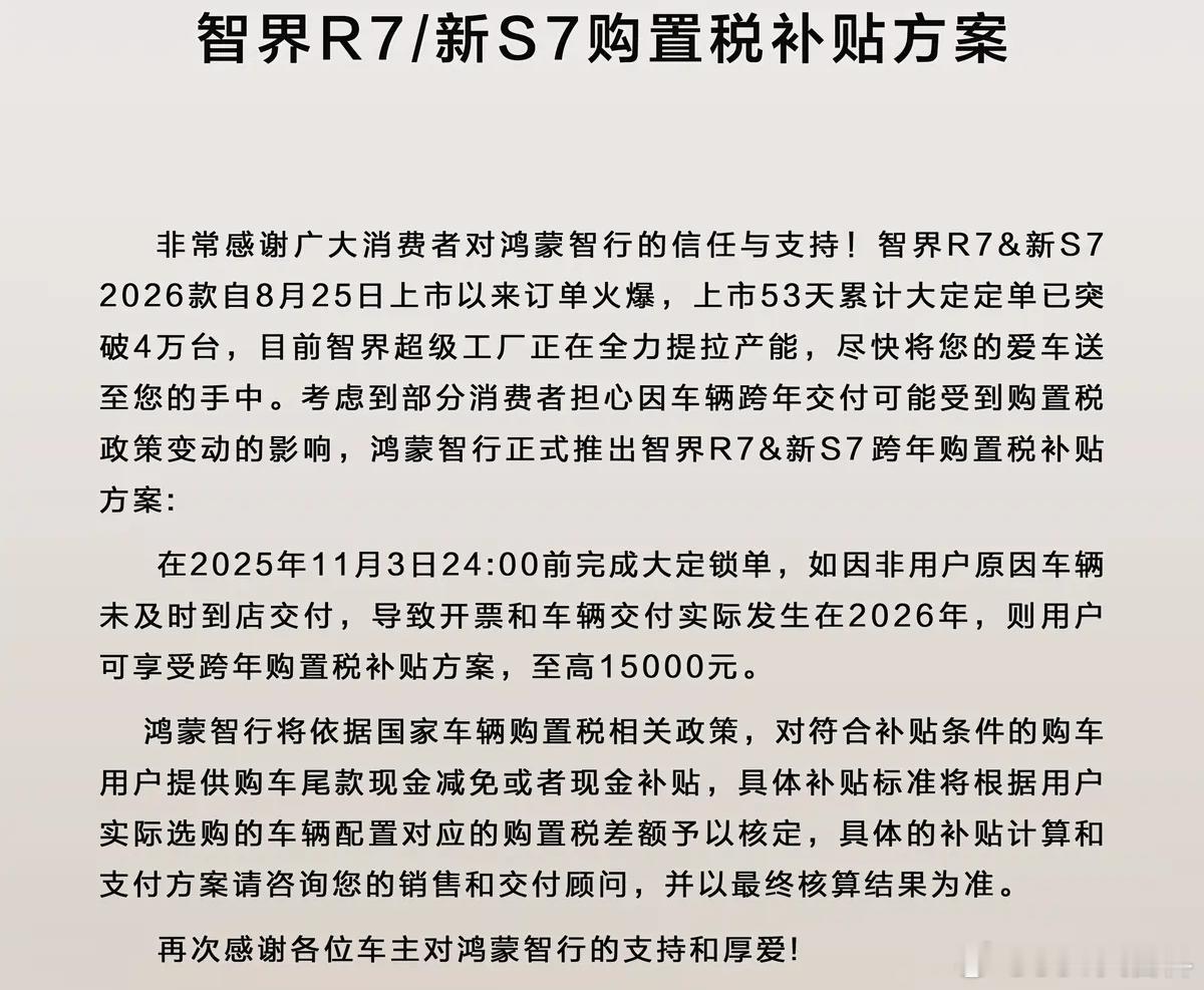 问界M7智界汽车 :11月3日24时前下定锁单,且因非用户原因,导致需在2026年开票交付者,可享跨年购置税补贴方案,尾款减免/现金补贴至高1.5万元