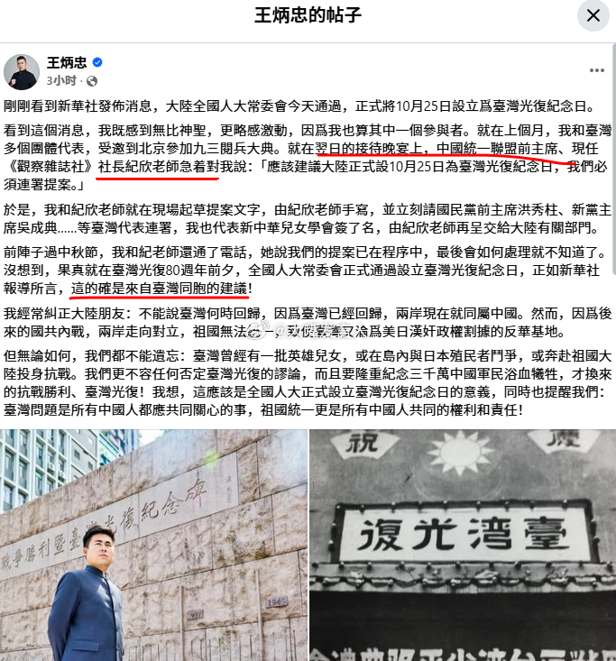 2. 【炳忠发文称:设立台湾光复纪念日,正如新华社报导所言,这的确是来自台湾同胞的建议!】(图2)