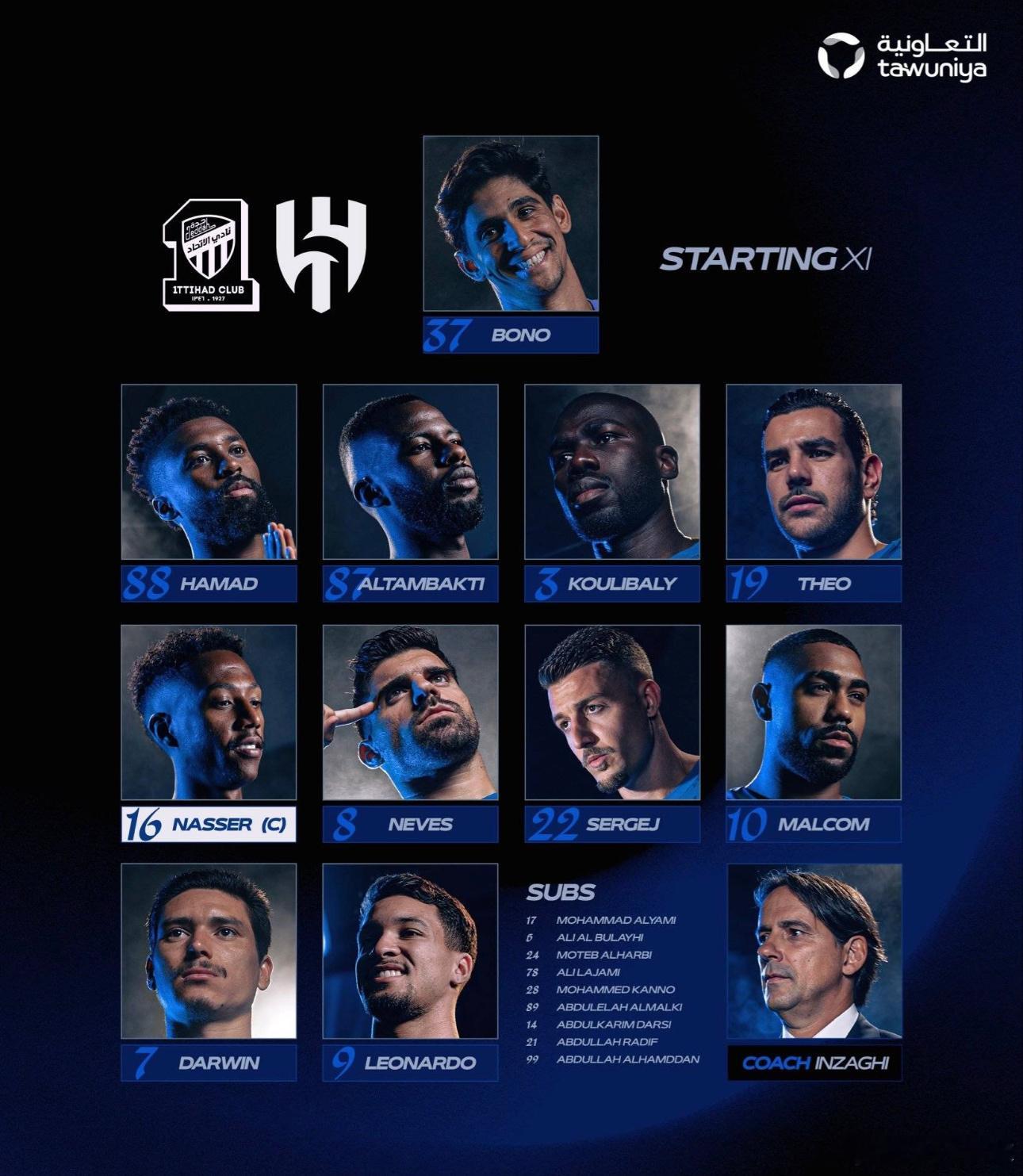 利雅得新月首发阵容:37-布努、3-库利巴利、19-特奥、87-坦巴蒂、88-亚米、8-内维斯、22-米林科维奇、16-多萨里、10-马尔科姆、7-努涅斯、9-莱昂纳多