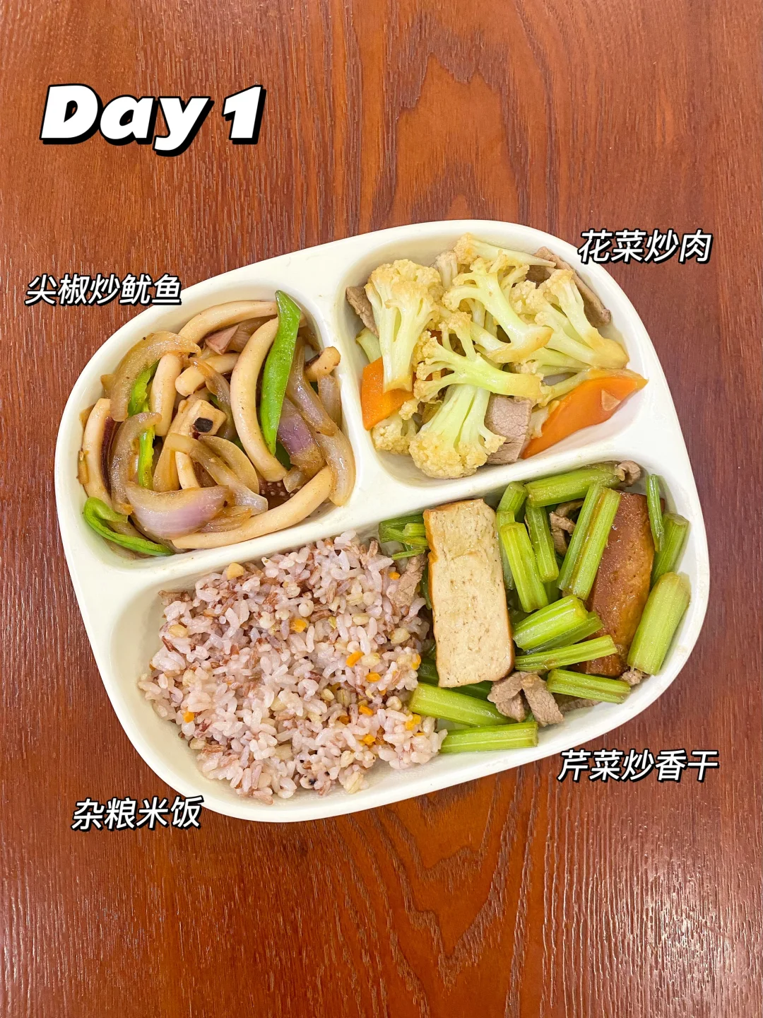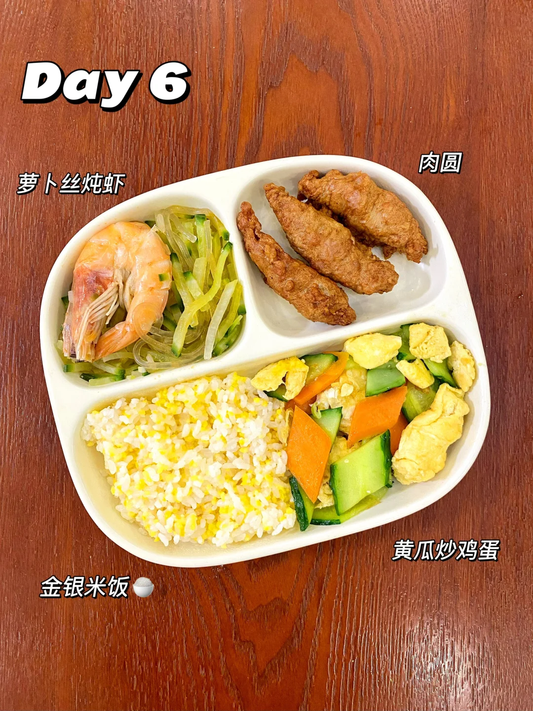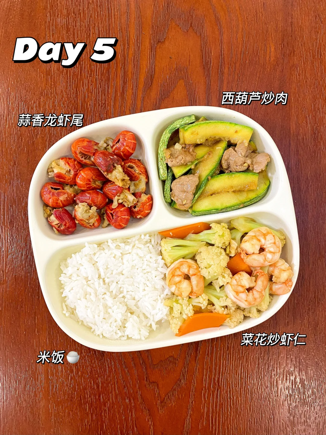 DAY11⃣️ 尖椒炒鱿鱼➕花菜炒肉➕芹菜炒香干➕杂粮米饭 DAY2⃣️ 炖鲅鱼➕韭菜炒香干➕黄瓜木耳炒蛋➕米饭 DAY3⃣️ 尖椒土豆片➕烤鸡翅香肠➕番茄炒蛋➕紫米米饭 DAY4⃣️ 白菜炒肉圆➕海米油菜➕牛肉饺子 DAY5⃣️ 蒜香龙虾尾➕西葫芦炒肉➕菜花炒虾仁➕米饭 DAY6⃣️ 萝卜丝炖虾➕黄瓜炒蛋➕肉圆➕米饭