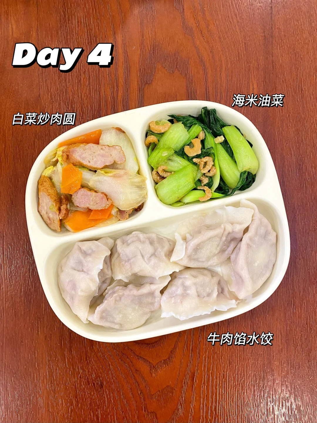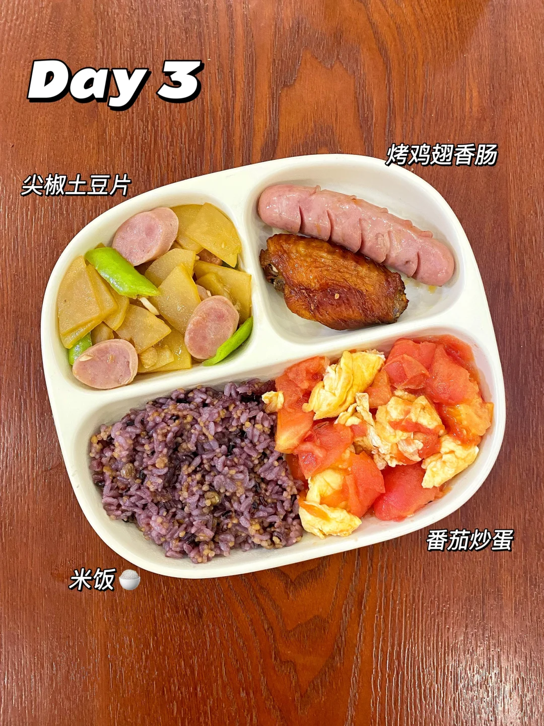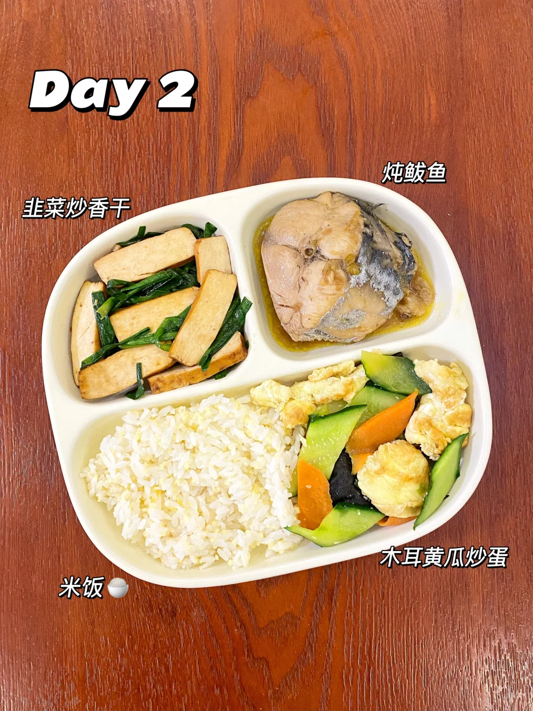 DAY11⃣️ 尖椒炒鱿鱼➕花菜炒肉➕芹菜炒香干➕杂粮米饭 DAY2⃣️ 炖鲅鱼➕韭菜炒香干➕黄瓜木耳炒蛋➕米饭 DAY3⃣️ 尖椒土豆片➕烤鸡翅香肠➕番茄炒蛋➕紫米米饭 DAY4⃣️ 白菜炒肉圆➕海米油菜➕牛肉饺子 DAY5⃣️ 蒜香龙虾尾➕西葫芦炒肉➕菜花炒虾仁➕米饭 DAY6⃣️ 萝卜丝炖虾➕黄瓜炒蛋➕肉圆➕米饭