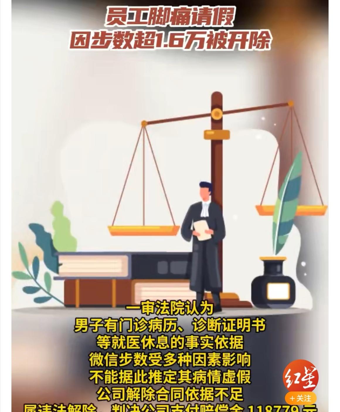 【公司太轴?员工脚痛请病假,微信步数惹祸被开除,法院判赔近12万!】 最近一桩劳动纠纷让不少打工人议论纷纷:某公司因为员工脚痛请了病假,可当天微信步数竟然飙到1.6万,公司据此认定他“装病泡假”,直接以旷工为由把人开除了。员工也不示弱,拿着门诊病历和诊断证明跟公司死磕到底,公司却坚决不信。这场争执最后惊动了法院。 法官怎么看这事?审理时直接指出:“微信步数只能作为参考,谁能保证步数高就一定满地跑?”影响步数的原因多了去了,手机摇一摇也能动,病人的真实情况不是靠个数码数据就能下结论的。于是,公司这一操作被定性为违法解除劳动合同,被判要赔偿员工118,779元。一纸判决,给公司上了堂大课! 公司没服气,上诉到二审,结果还是判决维持原判。网友看了都觉得:这波操作真是赔了夫人又折兵,“轴”到让人服气!这事也给企业和老板提了醒:处理病假别只盯着表面数据,规章制度要合理,证据链得扎实。不然遇上精明员工,不但丢了人情还得掉钱袋。 快讯总结:职场不是儿戏,一纸步数不能当“裁员锤”。员工身体有恙,企业管理还是得多些人情与法理,别凭直觉乱出招,否则学费可不便宜!