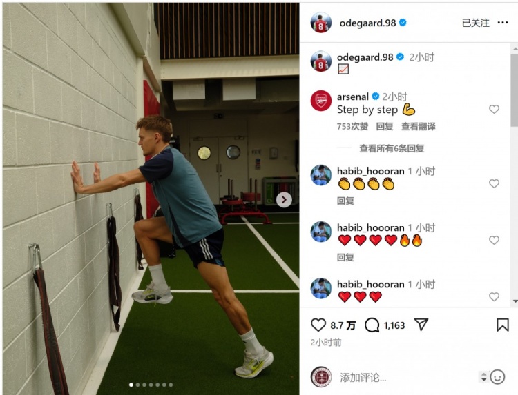 厄德高在10月4日对阵西汉姆的比赛中膝盖内侧副韧带受伤,他在社交媒体上晒出康复训练的照片,这位阿森纳中场正在努力恢复,希望尽快复出帮助球队。