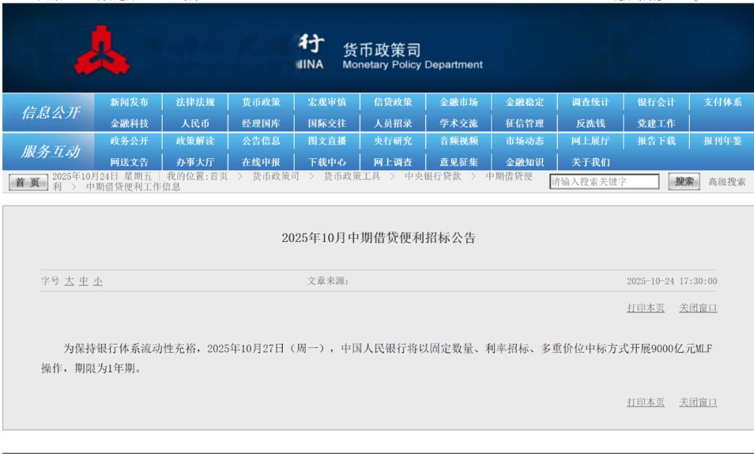 10月27日,中国人民银行将以固定数量、利率招标、多重价位中标方式开展9000亿元MLF操作,期限为1年期。[详情]