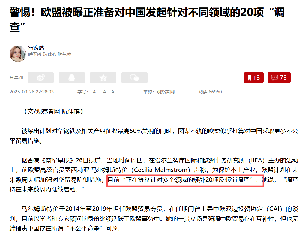 欧盟此时大规模筹备20项额外的反倾销调查,表面上是出于“公平竞争”的考虑,实则带有明显的防御色彩和政治操作意味。