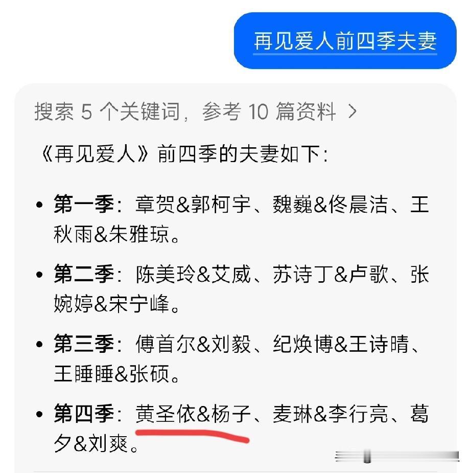 邓莎这个事之后,再见爱人估计以后很难请到明星夫妻了。 查看了一下前四季的夫妻,真正意义上的明星夫妻,只有杨子和黄圣依。 唯一吃到节目红利的,也是这一对。 宋宁峰和李行亮在上了节目后,事业都受到了影响。尤其后者,至今没有接到一个商演,也没有电视综艺敢找他了。 其实杨子黄圣依这对也经不起深扒,但是他俩比较幸运,因为“王炸素人”麦琳的横空出世,分担了大部分火力。 如果以后没有明星夫妻愿意来,没有明星,节目很难拉来投资,也很难破圈。 所以我个人觉得,这节目没有再办下去的必要了。