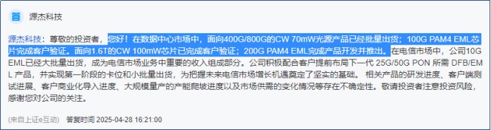 源杰科技面向400G/800G的激光器芯片产品已实现大批量出货;面向1.6T的光芯片也在下游客户处完成性能与可靠性验证。这些高端产品的逐步放量,将成为公司未来增长的核心动力。