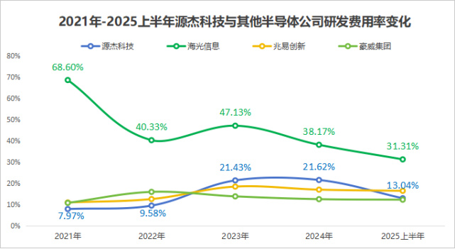 2020年至2024年间,源杰科技研发费用率始终保持在20%以上。这一投入强度虽不及海光信息等芯片巨头,但已媲美豪威集团、兆易创新等半导体大厂。